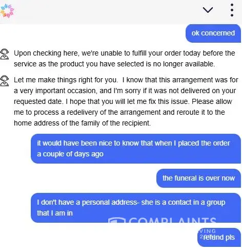 I placed an order several days ago for an arrangement to be delivered to an acquaintance's mother's funeral today at the church I specified by 10 am. When I checked on the order, it simply said unable to be delivered. I contacted the customer service chat and was told the order couldn't be delivered because the product was out of stock. The funeral is now...