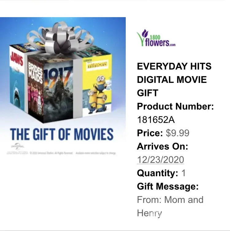 I ordered two gifts of flowers on December 3, 2020 to be delivered to two different homes on December 23, 2020. There was an add on "gift of movies" to be emailed to the recipients on December 23, 2020 so as not to ruin any surprise. The email would contain a link to pick a current movie to download onto their computer to keep. Each of these add on movie gifts cost me $9.99.