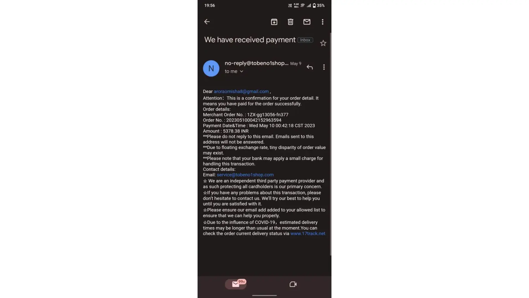 Dear Sohail.[protected]@gmail.com, The merchandise you purchased has been sent, the tracking No. is 'EV033417355CN', you can track it on http://www.17track.net/en to get the tracking information, thank you!If you could not get anything by this tracking no.Maybe the post office haven't updated the information in time,so please track it again later! Order details: Merchant Order No: 98601 Order No: 202304210617135377938 Contact details:Email: [protected]@tobeno1shop.com ------------------------------------------------------------------------------- ☆ We are the independent third party institution with credibility dealing with all disputes. ☆ We devote ourselves to safeguarding cardholder’s benefit. ☆ If you have any problems about this transaction, please don’t hesitate to contact us. We’ll try our best to help you until you are satisfied with it. ☆ Please set up our email address to be acceptable in order that we can help you in time.