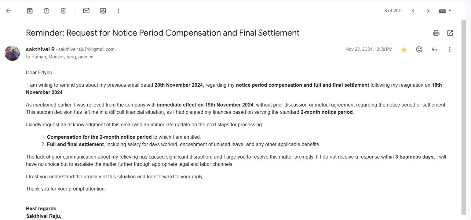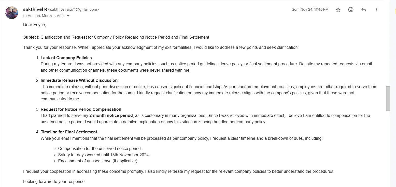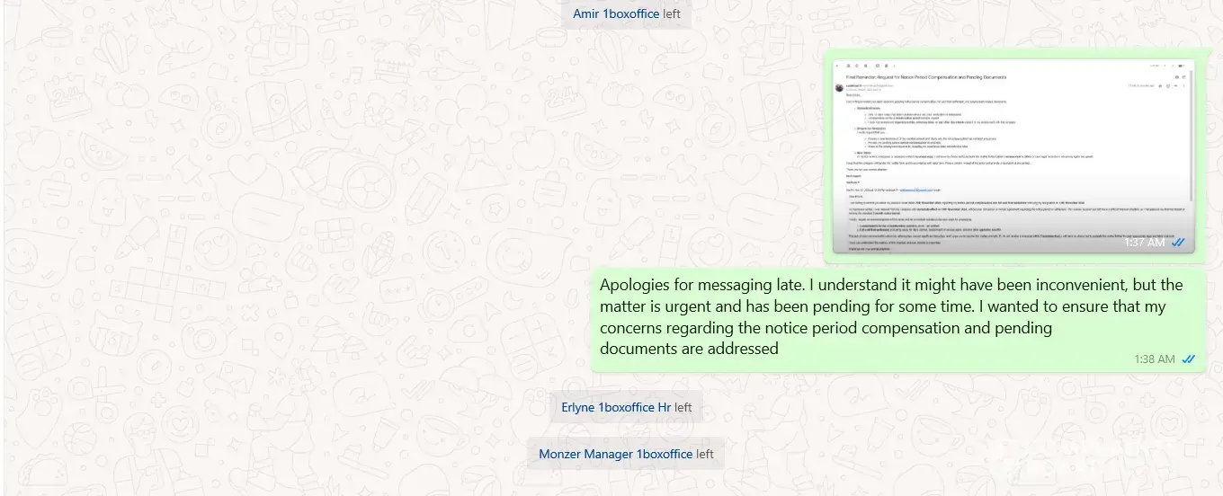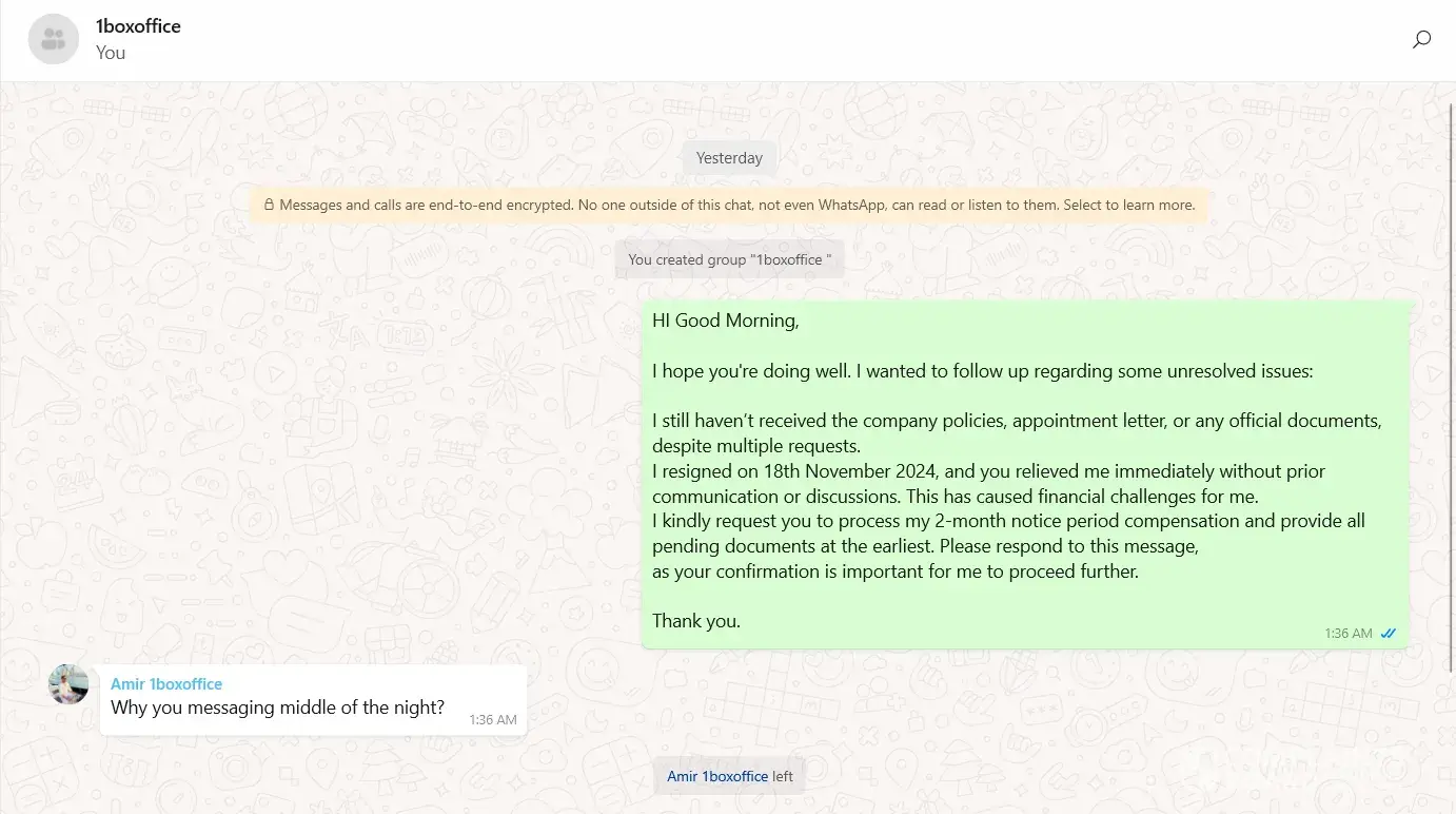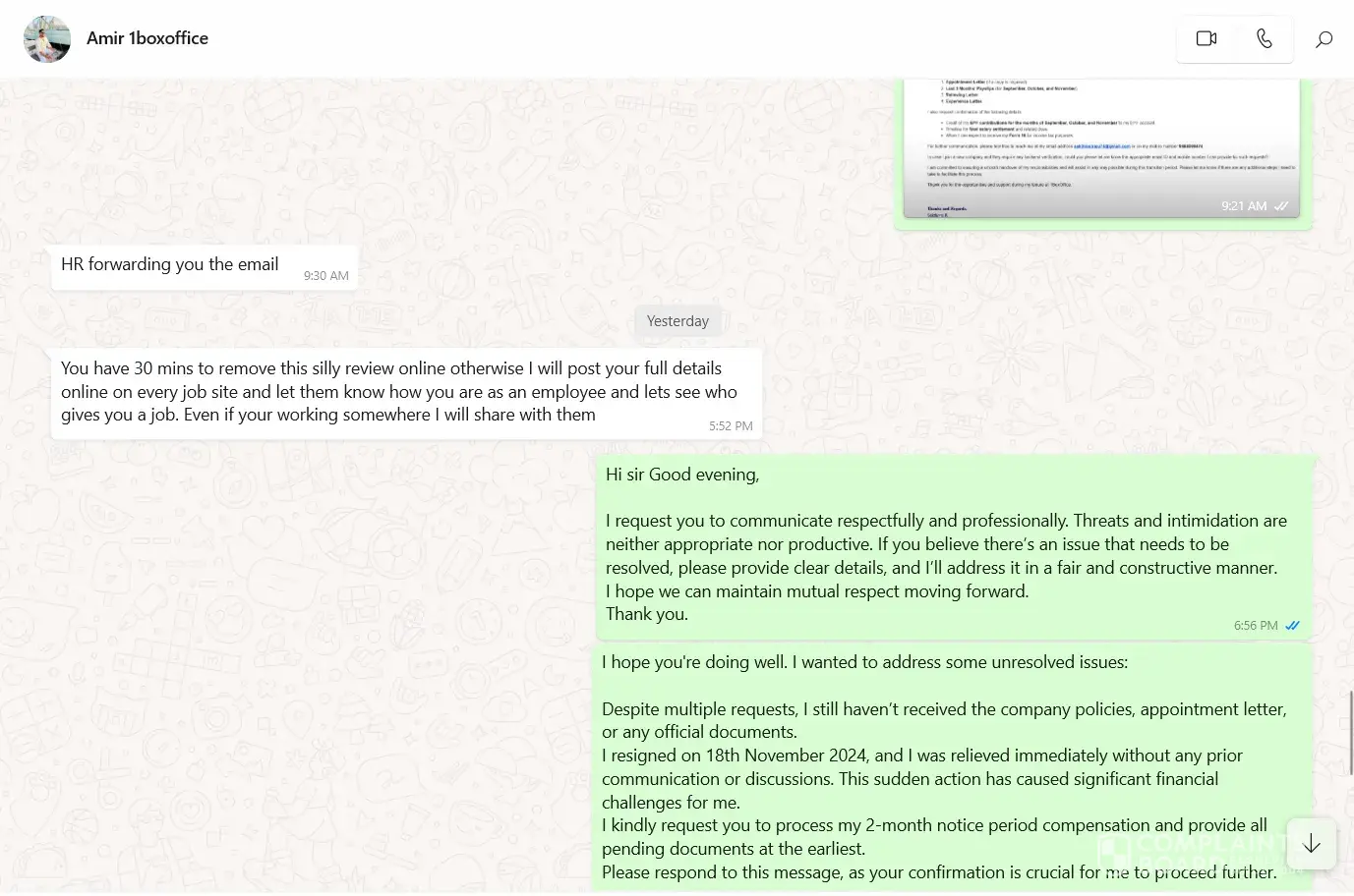I feel it is important to share my recent experience with 1BoxOffice to highlight the need for fair and professional practices in the workplace. Despite repeatedly requesting company policies, rules, and regulations, they were never provided during my employment. After resigning on 18th November 2024, I was relieved immediately the next day without any...