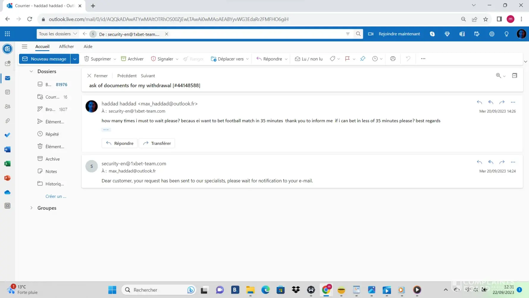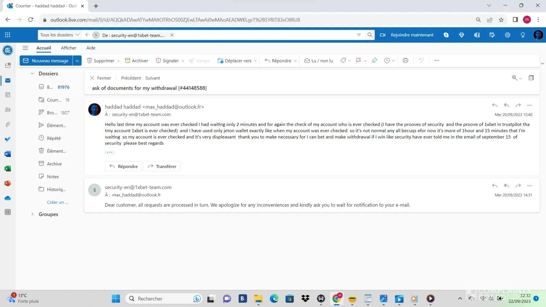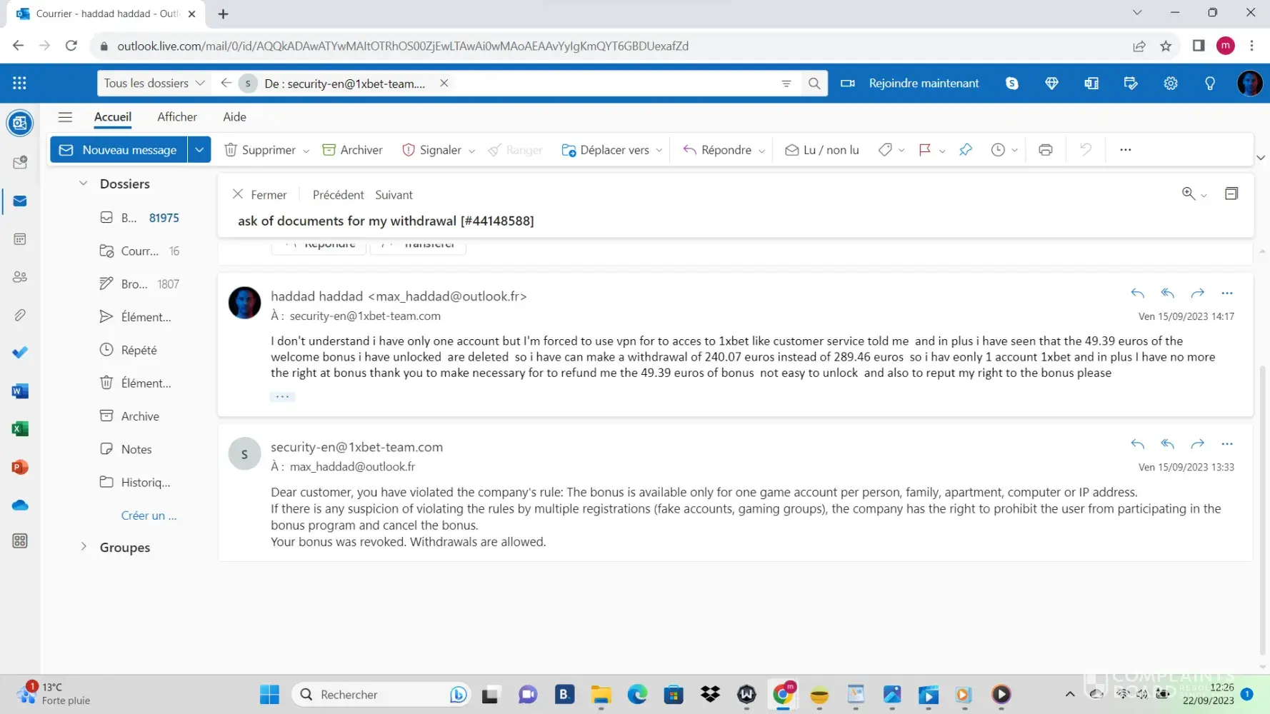 hello no answer from public realation 1xbet for 7 days ago for my problem of can no more on my account 1xbet my 1xbet account number [protected] if that can help I want to can bet and my bonus of 49.32 euros unlocked confiscated unfairly come back on my balance and my right to have bonus cdly