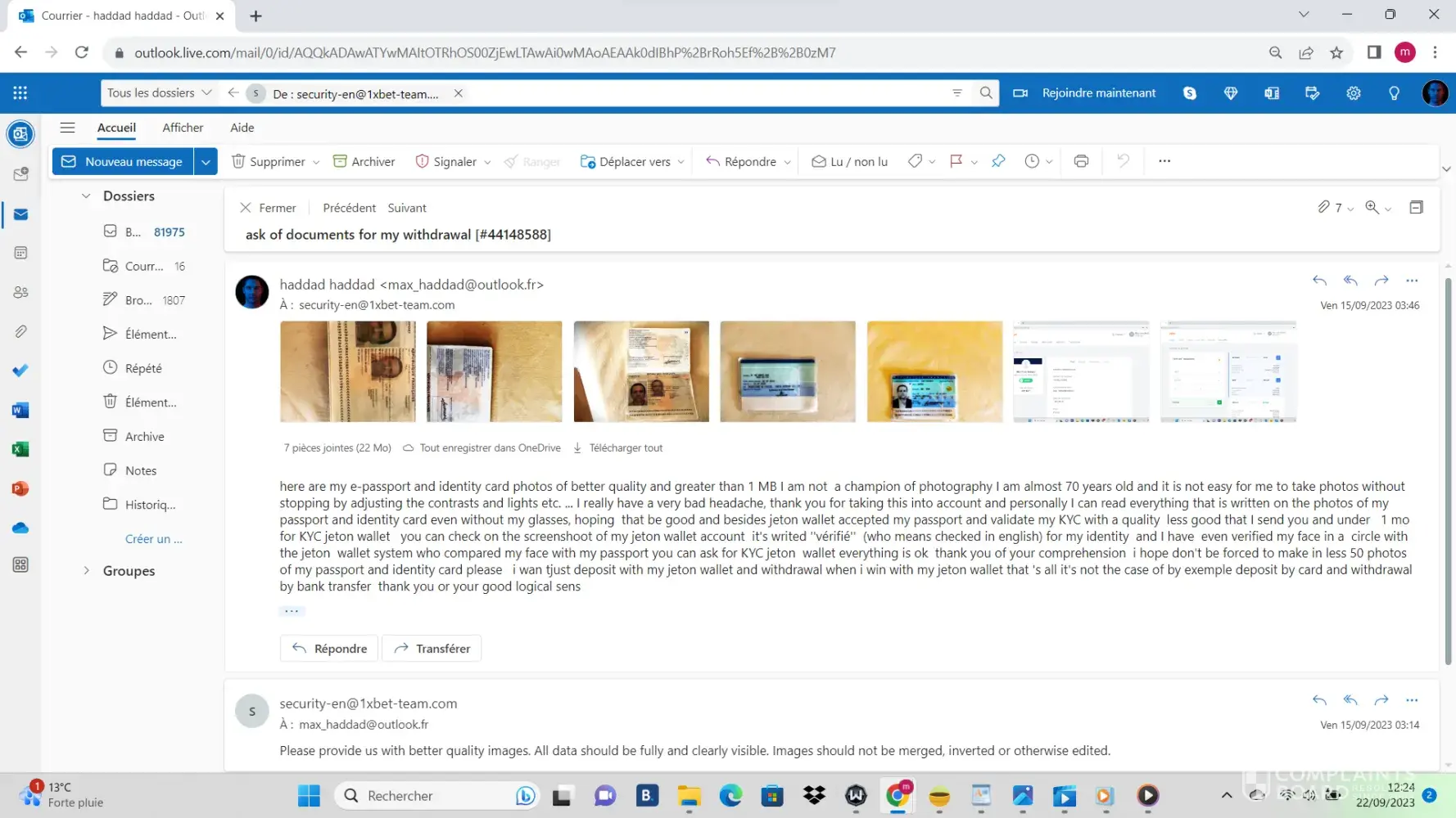 Before that, 1xbet had already required a series of documents, all of which were delivered. (Photo of the identity card, photo of the holder holding the identity card and photo of the holder holding an ID card next to the email conversation on the computer). All this process only occurred after a withdrawal attempt. Long time. I wait for your help.