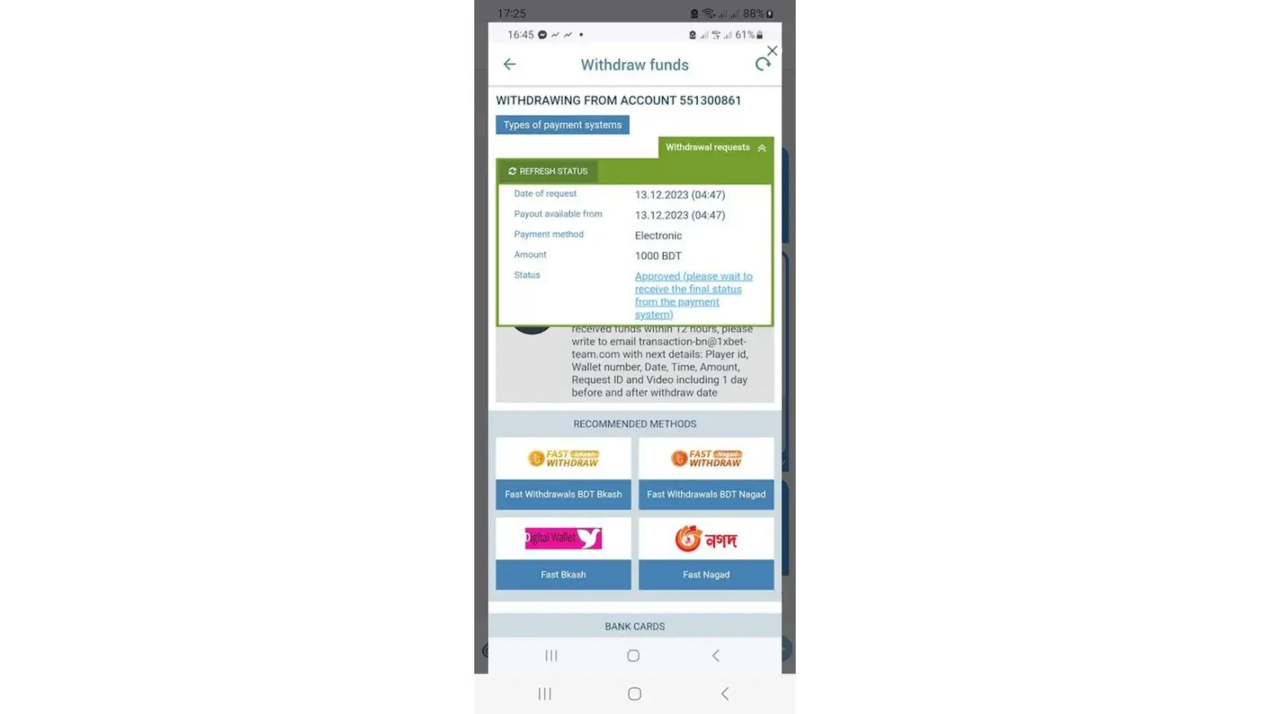 Withdraw amount 1000 taka not receive my bKash number. Screen shot given