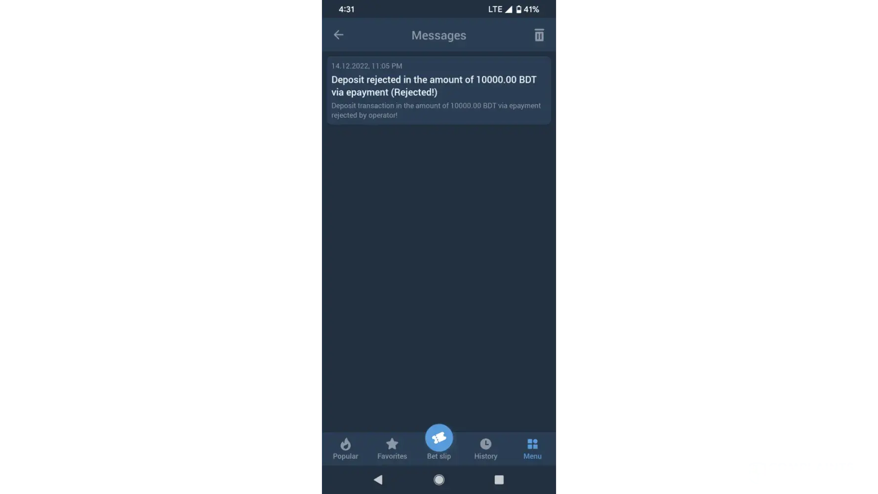 yearstarday i deposited 1000 taka by bkash. but operator rejected my deposit. i sent several mail stating my problem and proofs. but no response from support team.