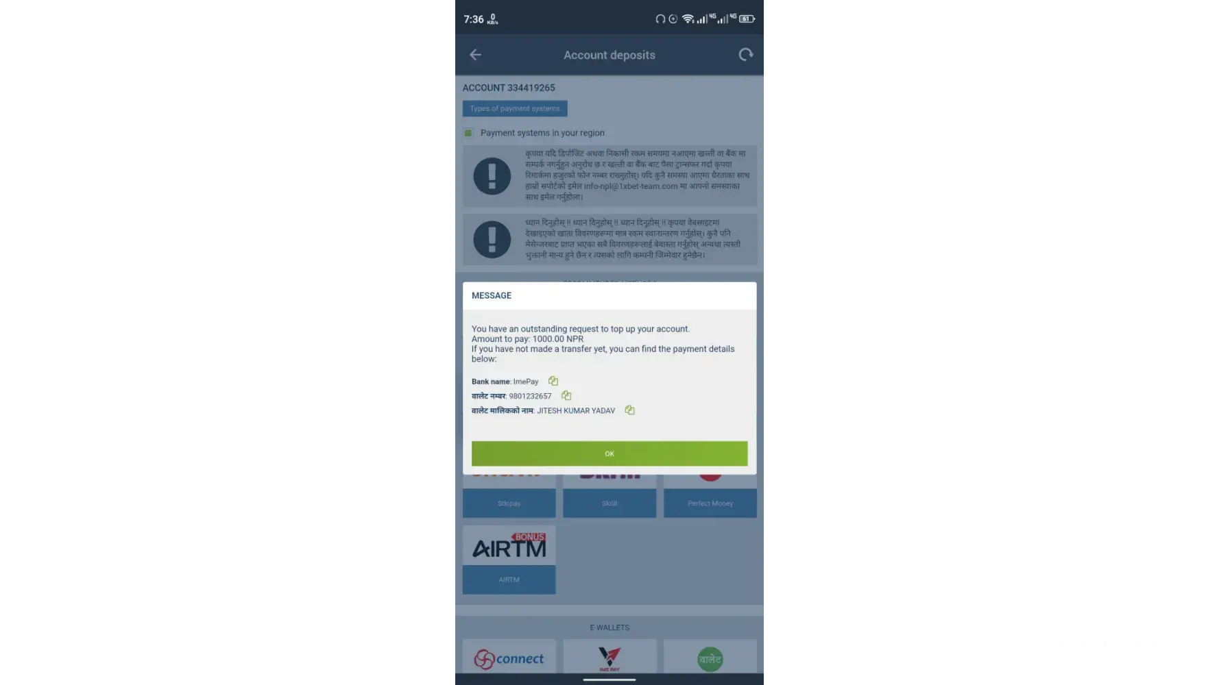 I pay 1x agent through E-wallet (ime pay ) from Nepal payment was done but my account was not loaded till now it's almost 2 days technical support team keep saying wait for sometime wait for sometime wait for sometime and do nothing. It's trashy reply always. My 1x bet id is [protected]