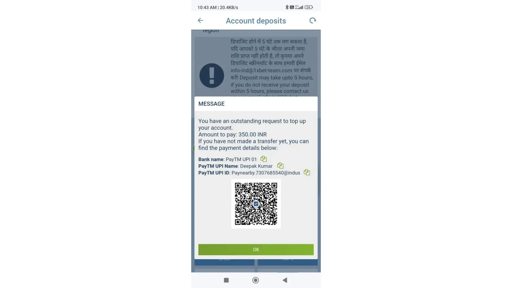 I transfer INR 350 from paytm upi , and request for deposit.