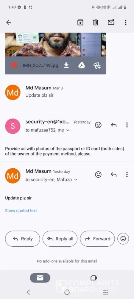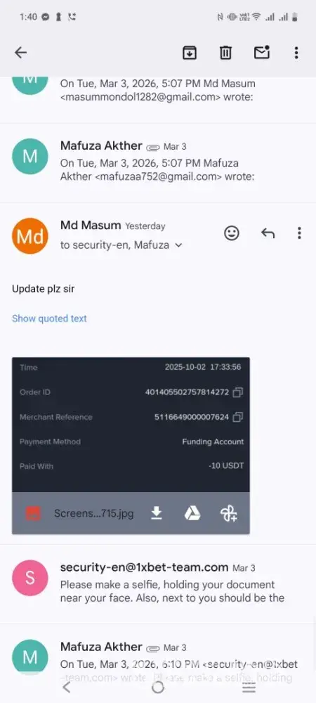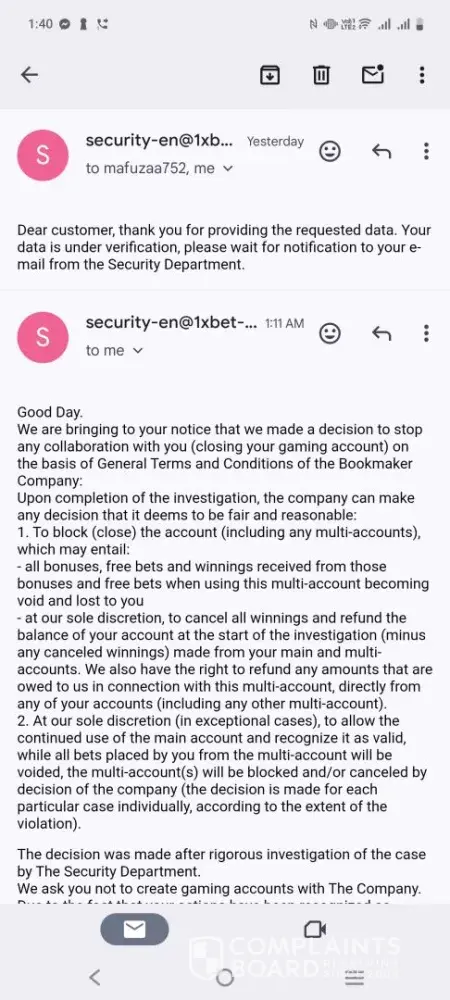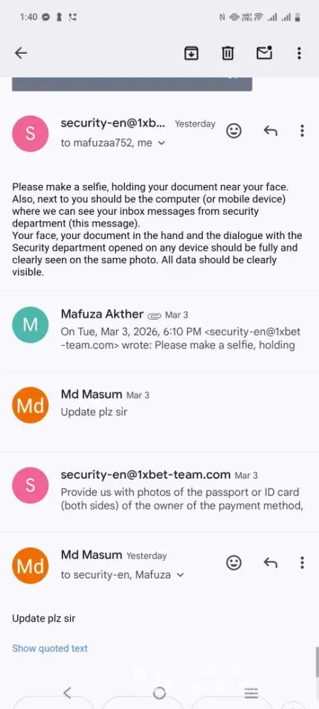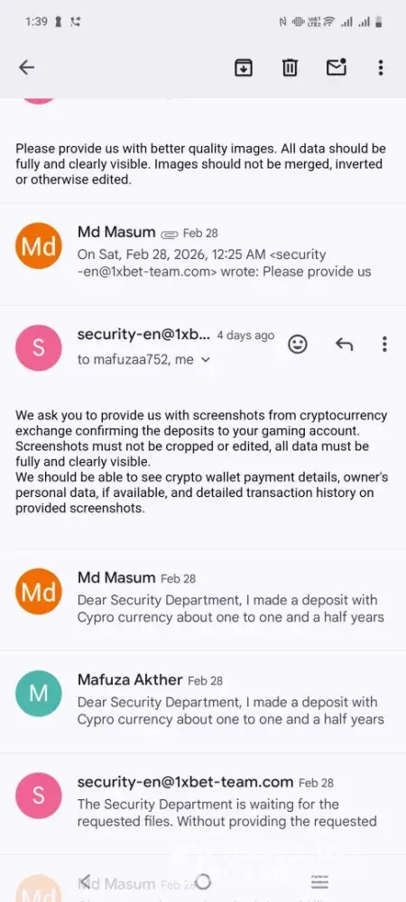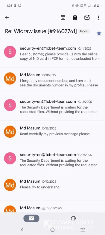 I have fully cooperated and complied with every verification requirement. However, 1xBet has still failed to release both my deposited funds and my legitimate winnings.
