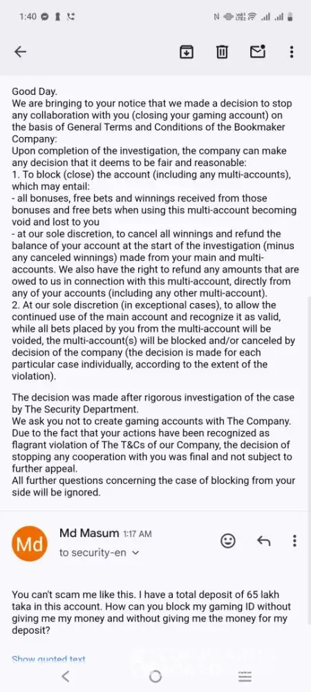 I deposited 65 lakh taka in my account now there was 1 lakh 84 thousand taka in the account now they have blocked my gaming account without giving me my money under which law they did this they have no rules like this. Let them block their account I have no problem they will give me my deposit funds. Please help me. They have blocked my account without giving me my loss money