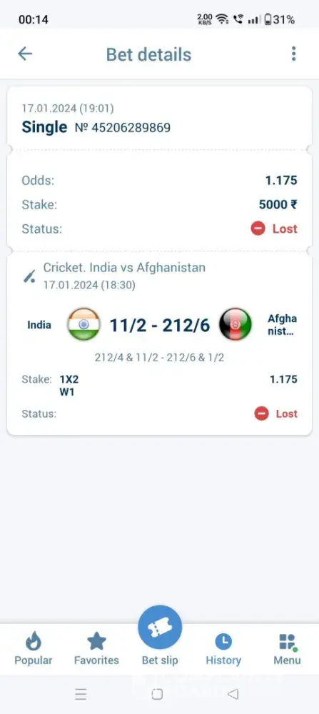 Sir I have placed a bet on team 1 and it's around 25 k,.By the end of the match india won by super over but it's showing that I am lost the bet. Kindly help.The amt 25k is big for middle class people.kindly respect that and refund the amount.I dnt want any extra money frm my win ,just return the capital tht is enough.or else I have to take legal action