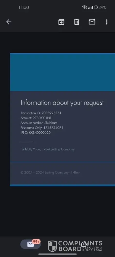 I already contacted 1xbet hundreds of time on e-mails. For my withdrawal of 9730 INR which was successful on 6 January & still not received. First they asked me for bank statements, when i provided them they asked for confirmation from bank, when i again provided them, they are now copy pasting the same thing. It is paid & raise issue in my bank again. Thi...