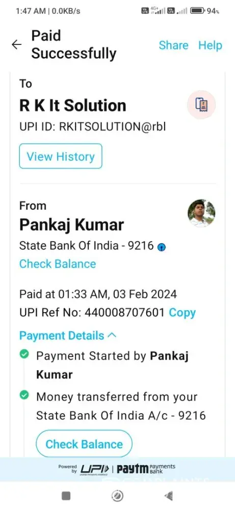 Sir maine Rs 1600 ₹upi I'd [protected]@rbl ke account me maine paytm ke dwara payment diposit Kiya time 1.33am date 3/2/24 utr nom.[protected] lekin account me abi Tak paise credit nahi hua hai so please check kare sir mygaming I'd [protected] please check kare aur mere amount ko my gaming I'd per refund ker de apki badi maherbani hogi please check kare