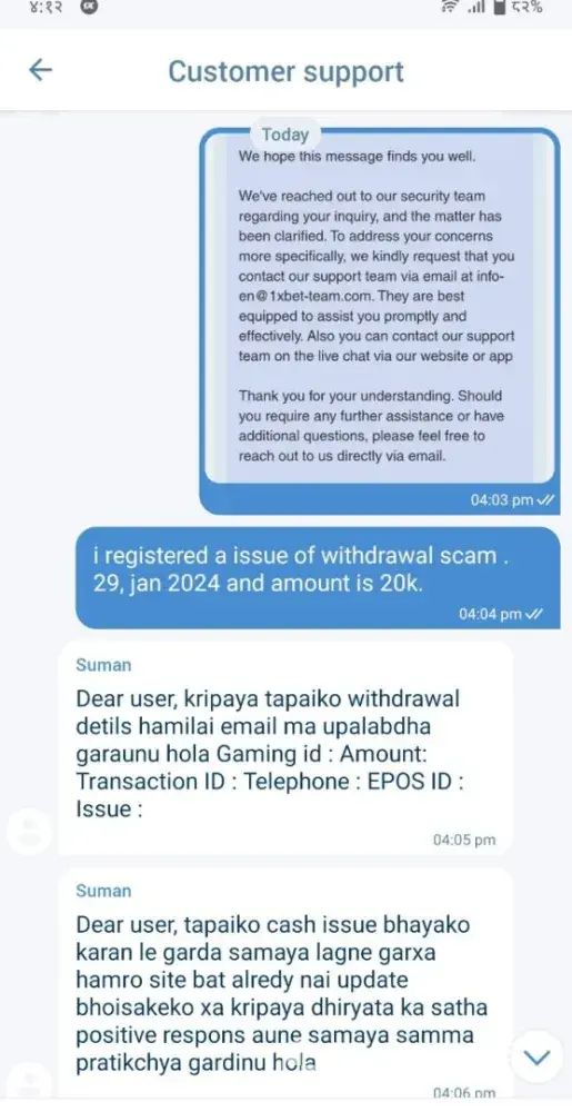 Although, its been a 19 days of scammed and 18 fays of complain i made there is no action against 1XBET CASH AGENT. My issue isnot updated and i didn't get justice. I am uninstalling this 1XBET application and request you all to do as same. With another complain i am going to public my cash agent details, Bank account numbers and Phone number here and others scammer sites. Be Aware Everyone, Thank You!