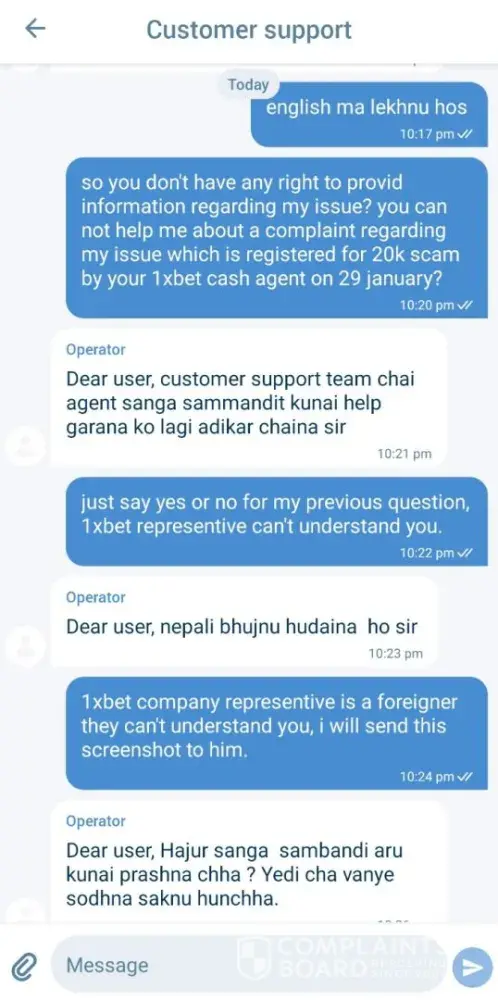 Your support team ignored me to help for related issue, i requested him to respond in english but he denied. He said he don't have rights to help me about 1xbet cash agent. He ignored my question and trying to close my chat forcefully. I was scammed by your agent and now suppport operater didn't help me. I also sent a screenshot of this conversation but he denied to help me further.
