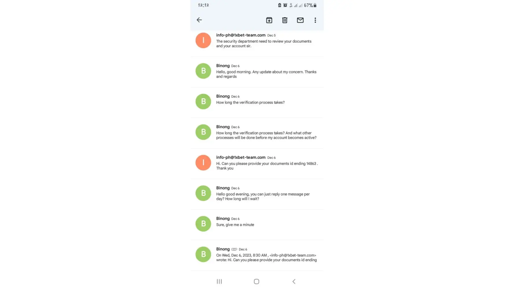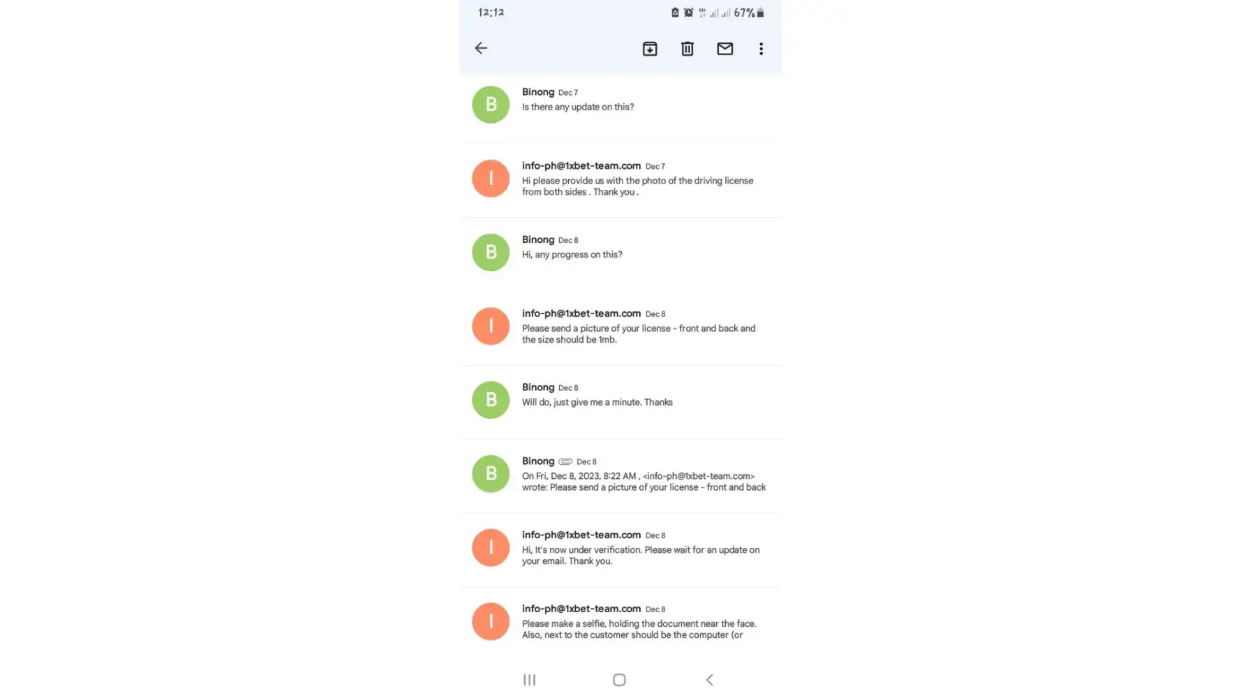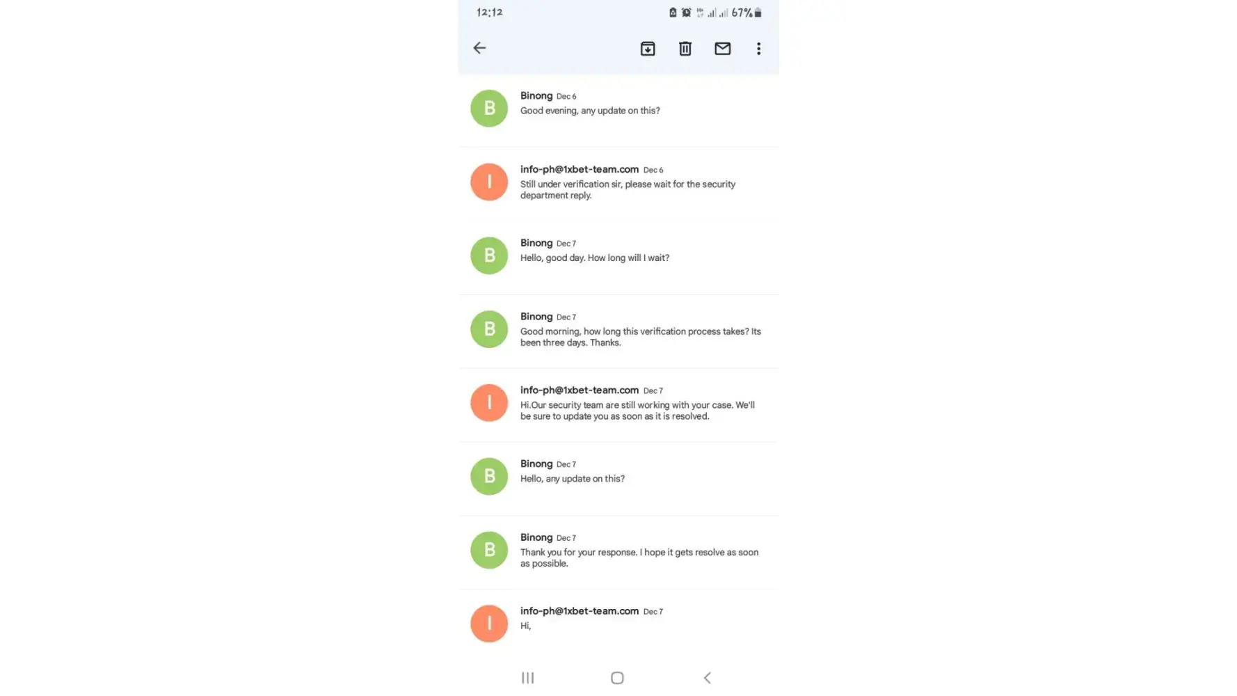 From Dec, 5, 2023 at 6:30 pm onwards I already message the security team of 1xbet, doing what they want, taking photos, sending all they need. But until now there's still no progress. They can't even reply on time. If they reply they just say take another photos and blah blah blah. What I want is to have a cashout transaction on my account. It's been a week and still no update or progress. #[protected]. Can someone help me about this matter? It's been a week! I follow all they want. I am being polite as much as I can, but they're not doing their job properly.