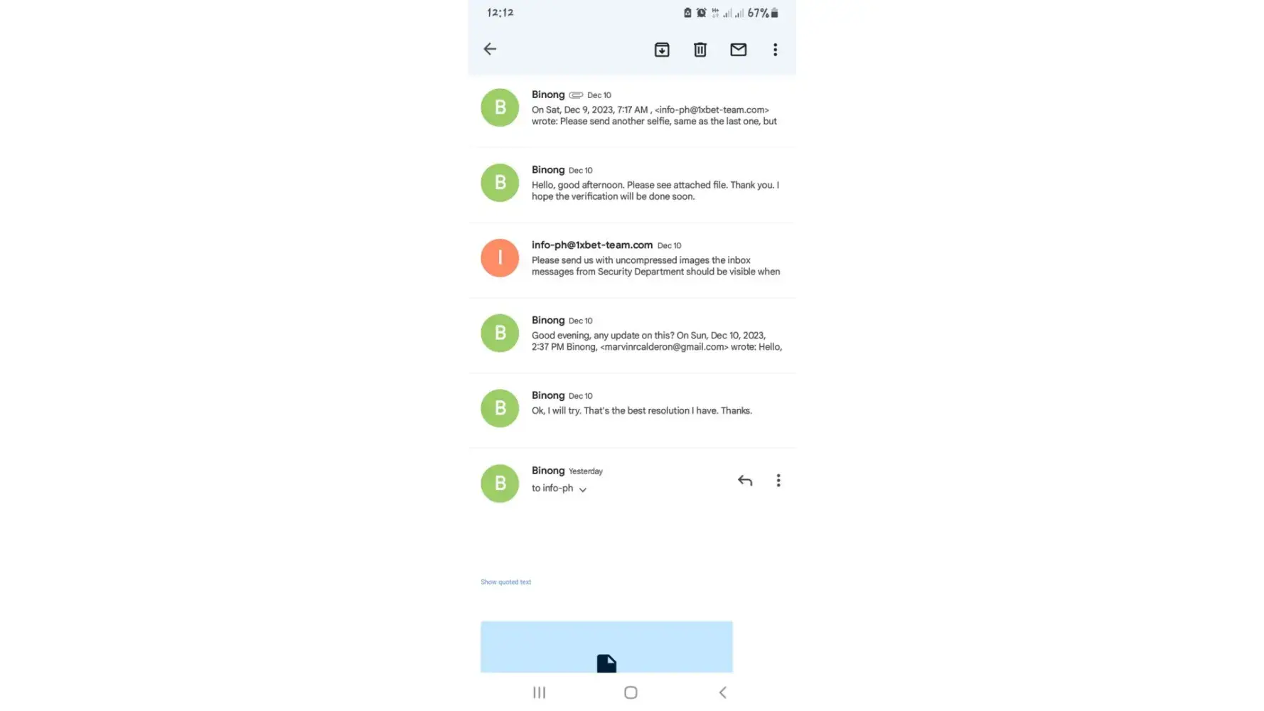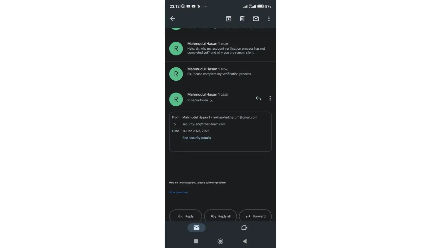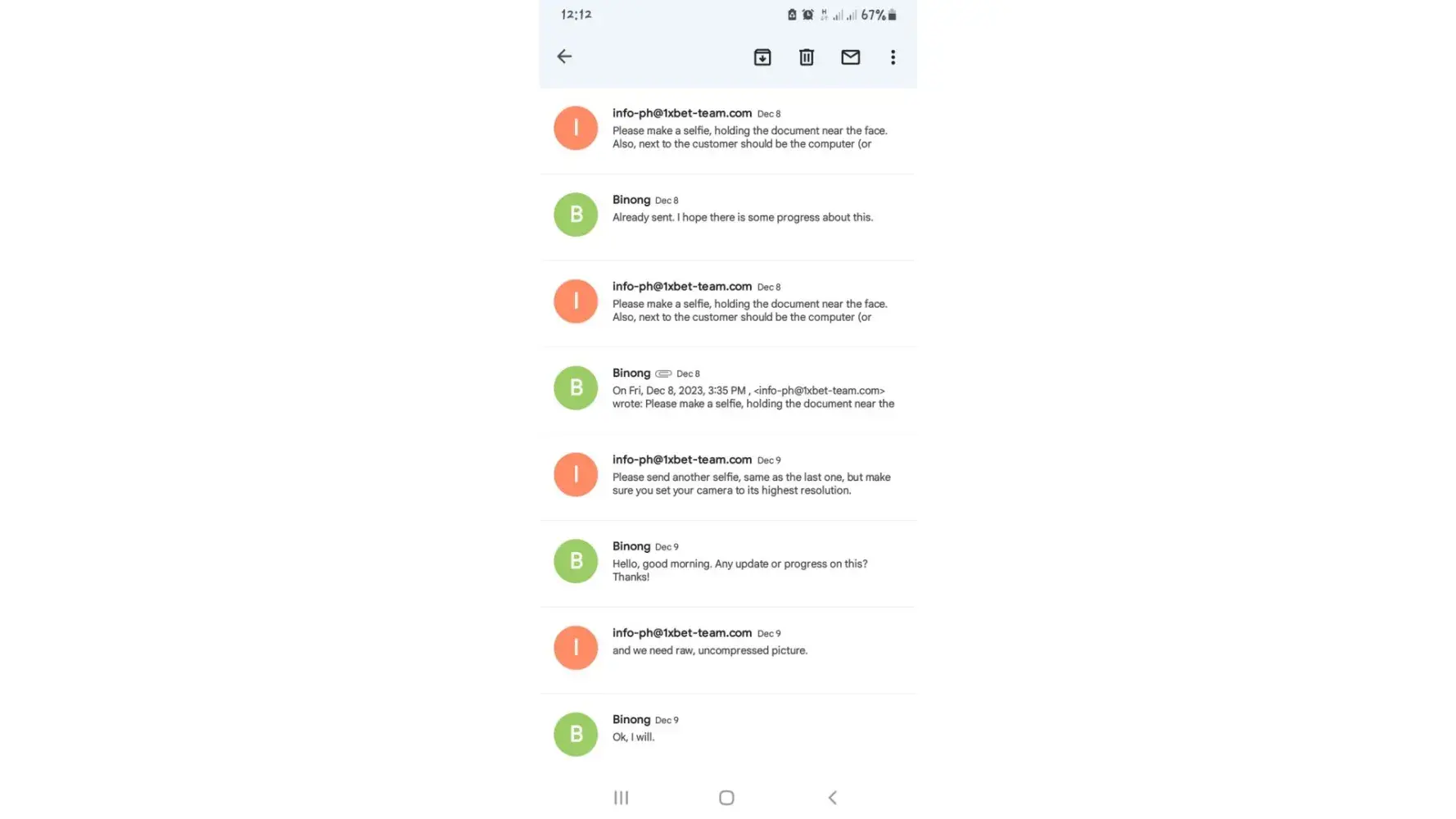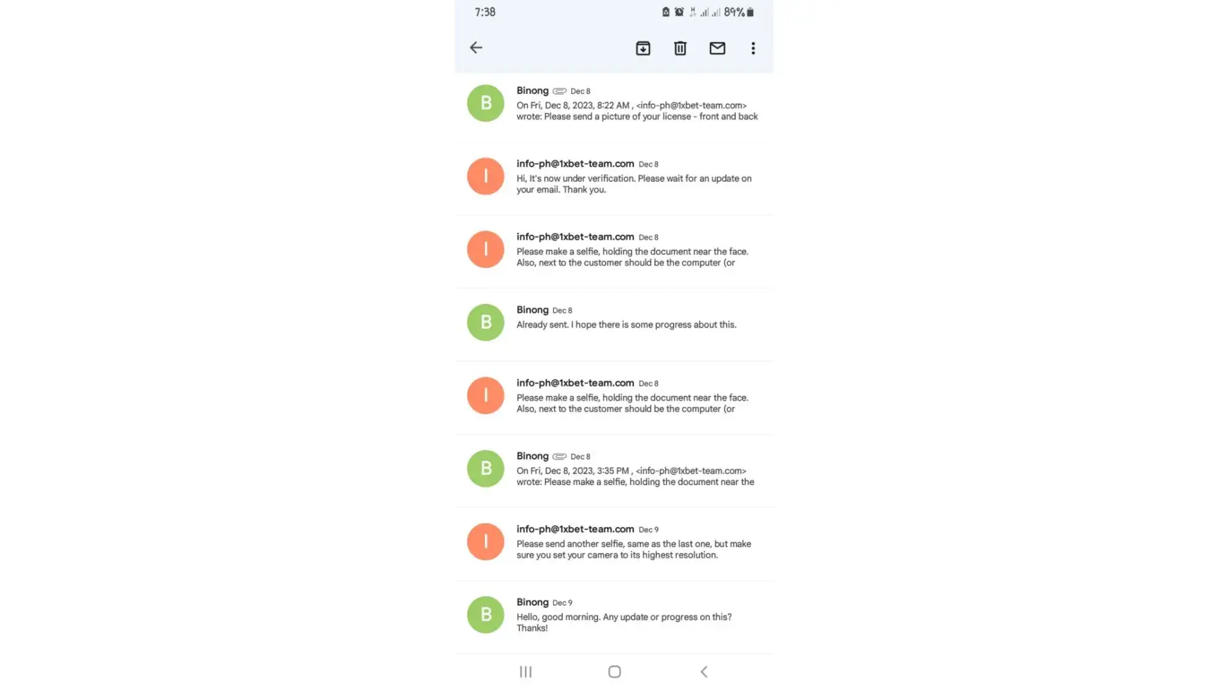 From Dec, 5, 2023 at 6:30 pm onwards I already message the security team of 1xbet, doing what they want, taking photos, sending all they need. But until now there's still no progress. They can't even reply on time. If they reply they just say take another photos and blah blah blah. What I want is to have a cashout transaction on my account. It's been a week and still no update or progress. #[protected]. Can someone help me about this matter? It's been a week! I follow all they want. I am being polite as much as I can, but they're not doing their job properly.