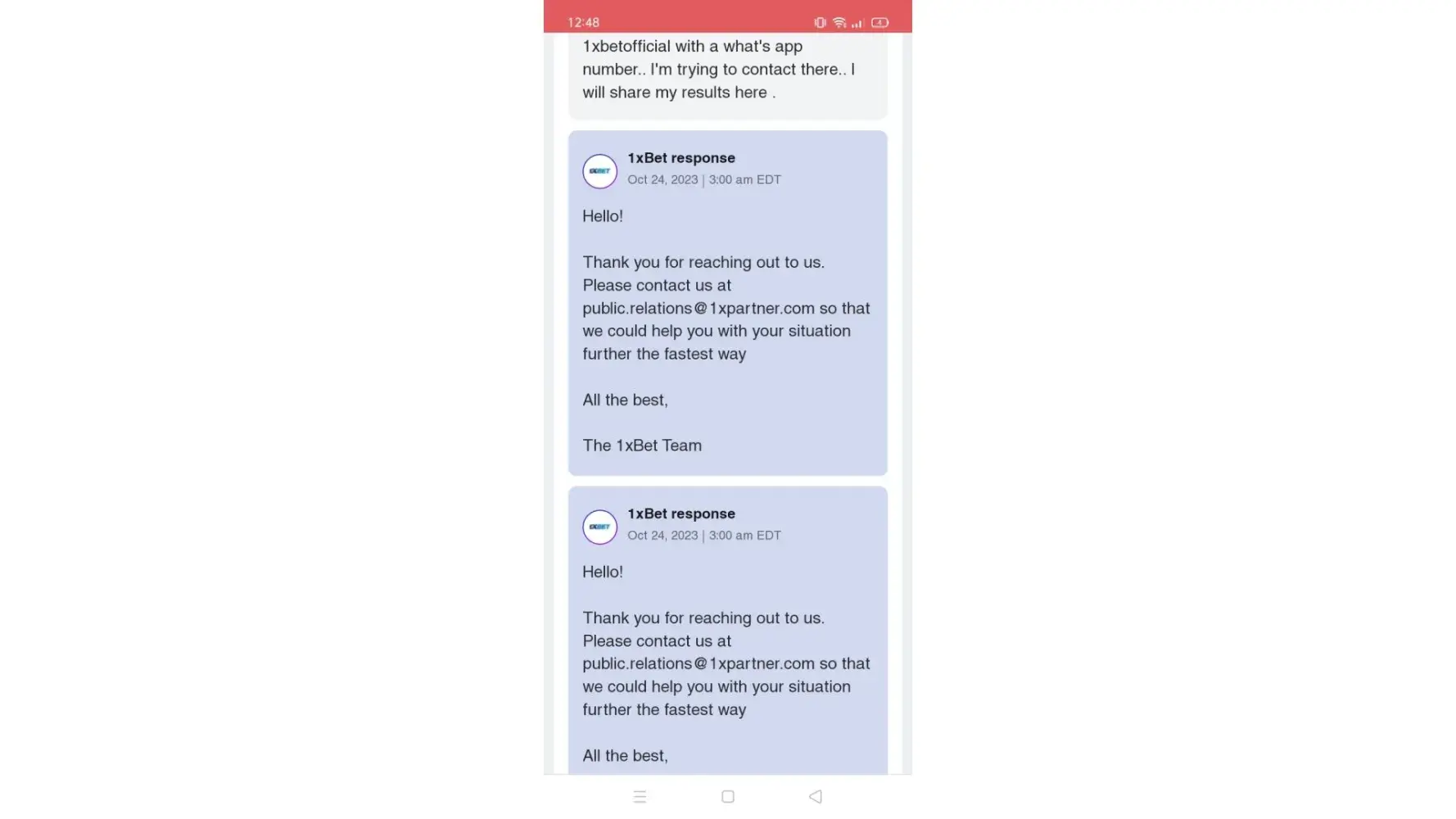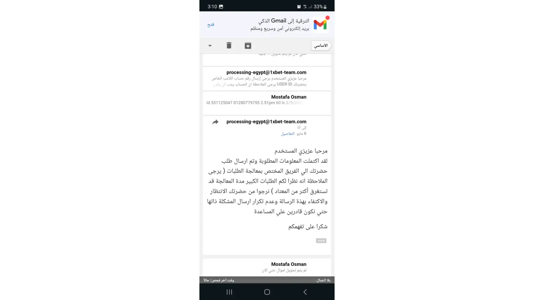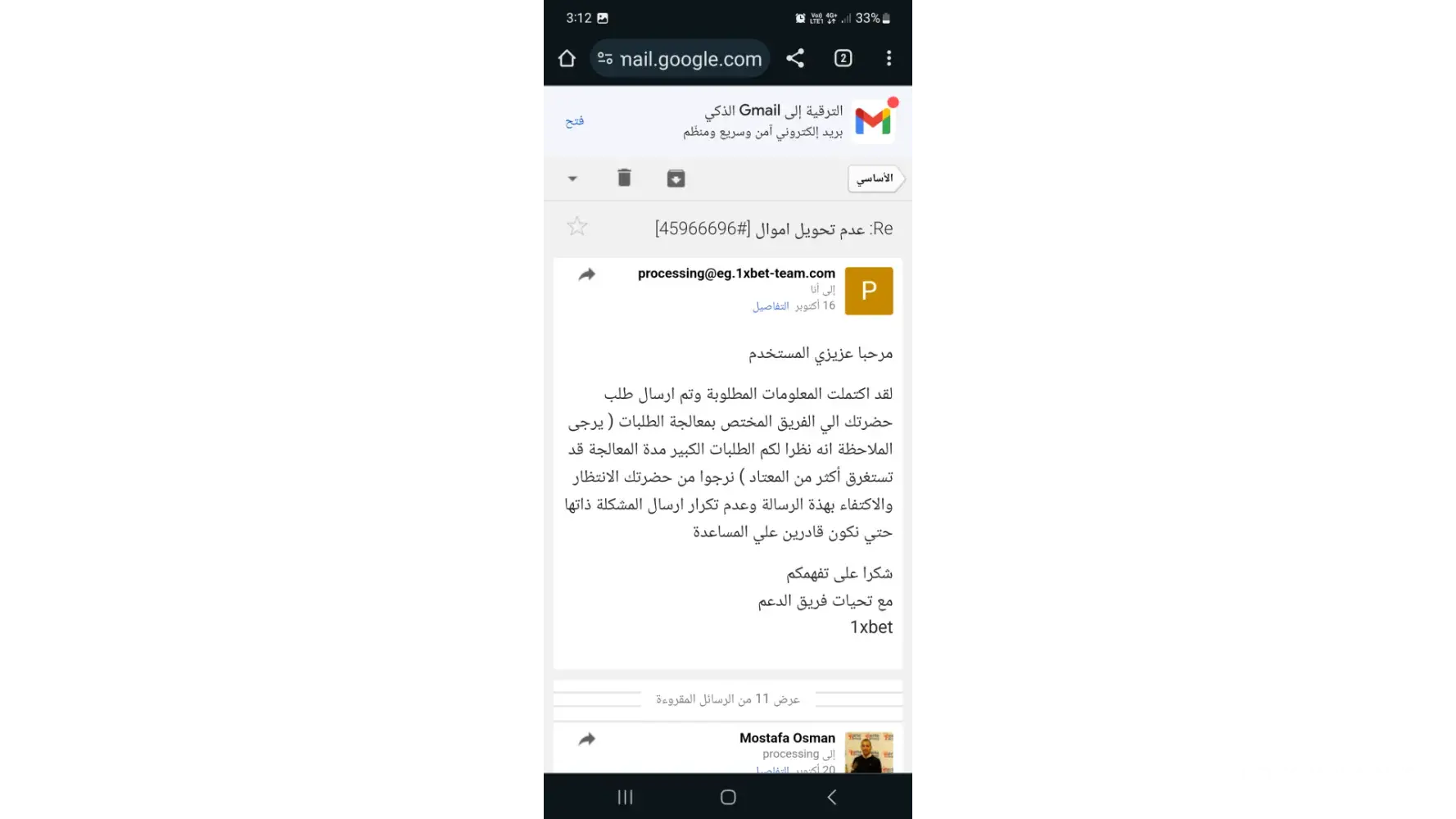 At 12/10/2023 i made withdrawal 500 le two times . One of them transferred and the otherd cannot transferred . I sent many emails to [protected]@eg.1xbet-team.com