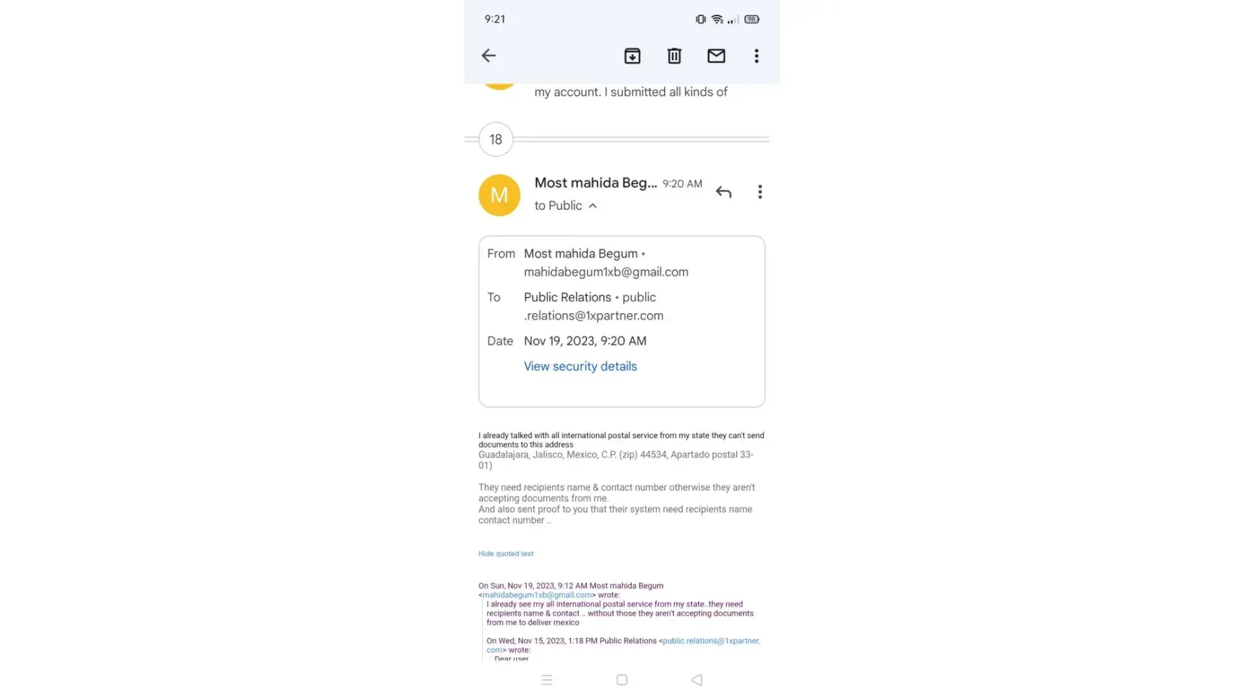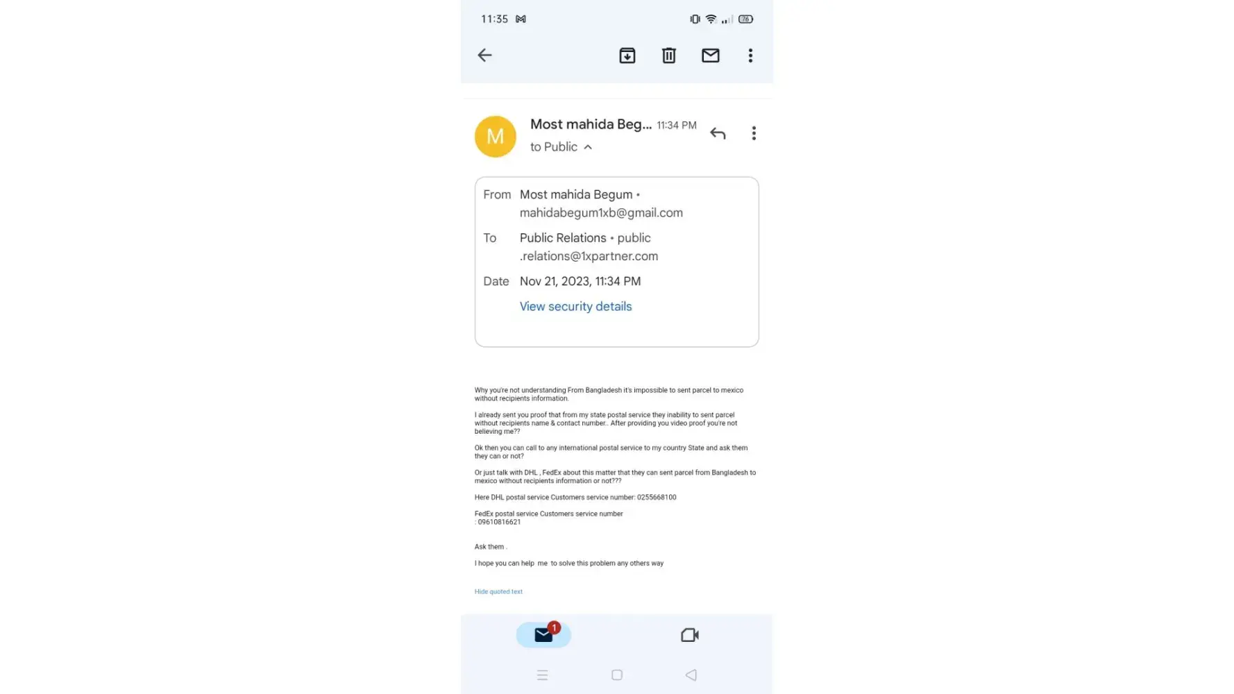 As we already talked about this matter that it's impossible to sent parcel from Bangladesh to mexico without recipients name & contact number . After reviewing my complained you said you will handle this case and will findout suitable way for this to solve this problem..but why again telling me same thing that many parcel arriving to this address..