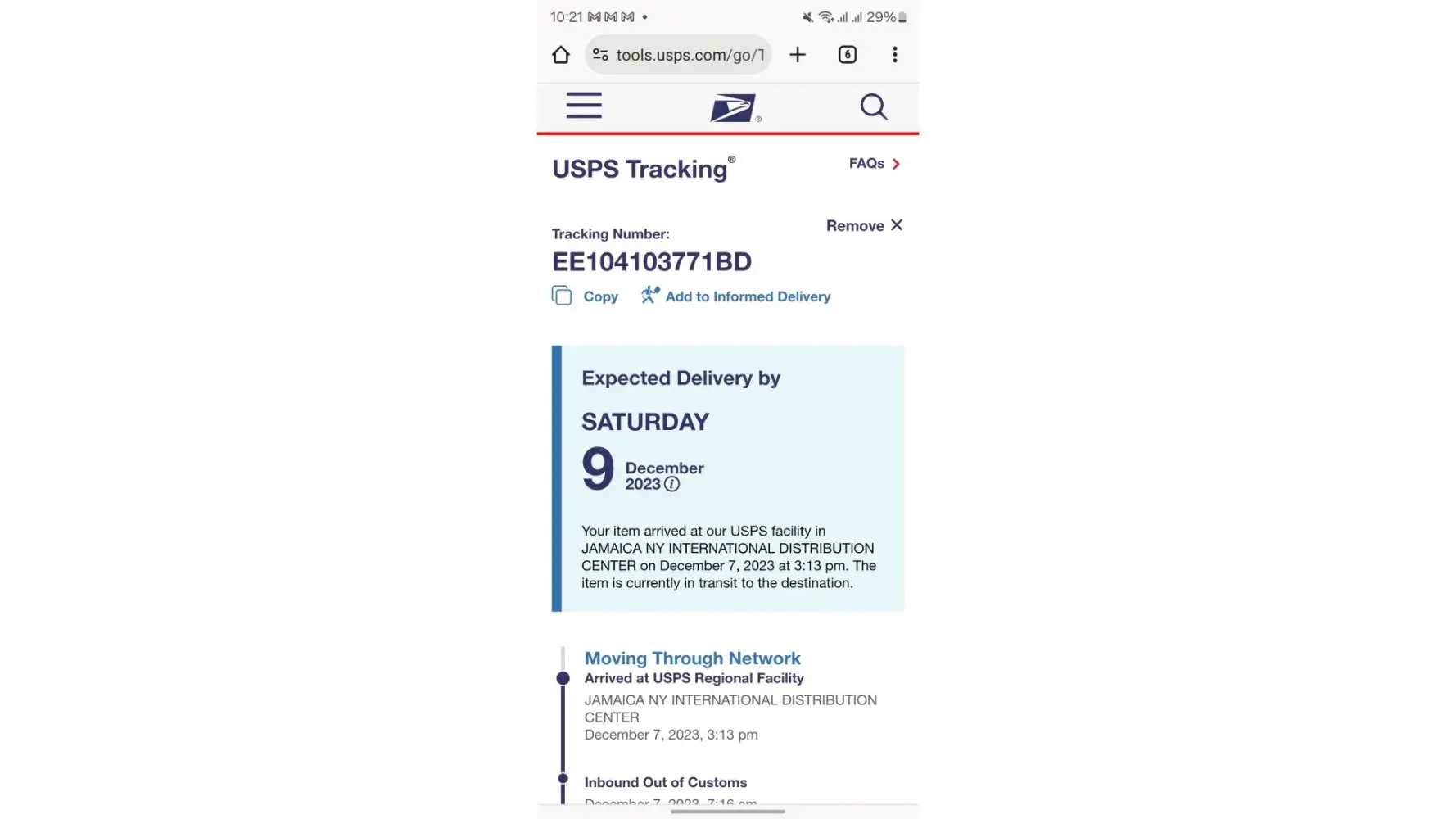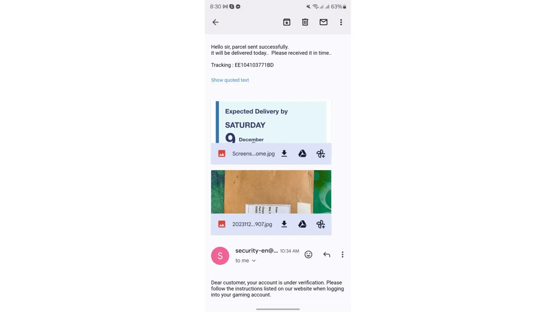 Hello dear Alex, Yesterday i sent an email to security Department to notify them that my parcel sent successfully it will be delivered 09 December .