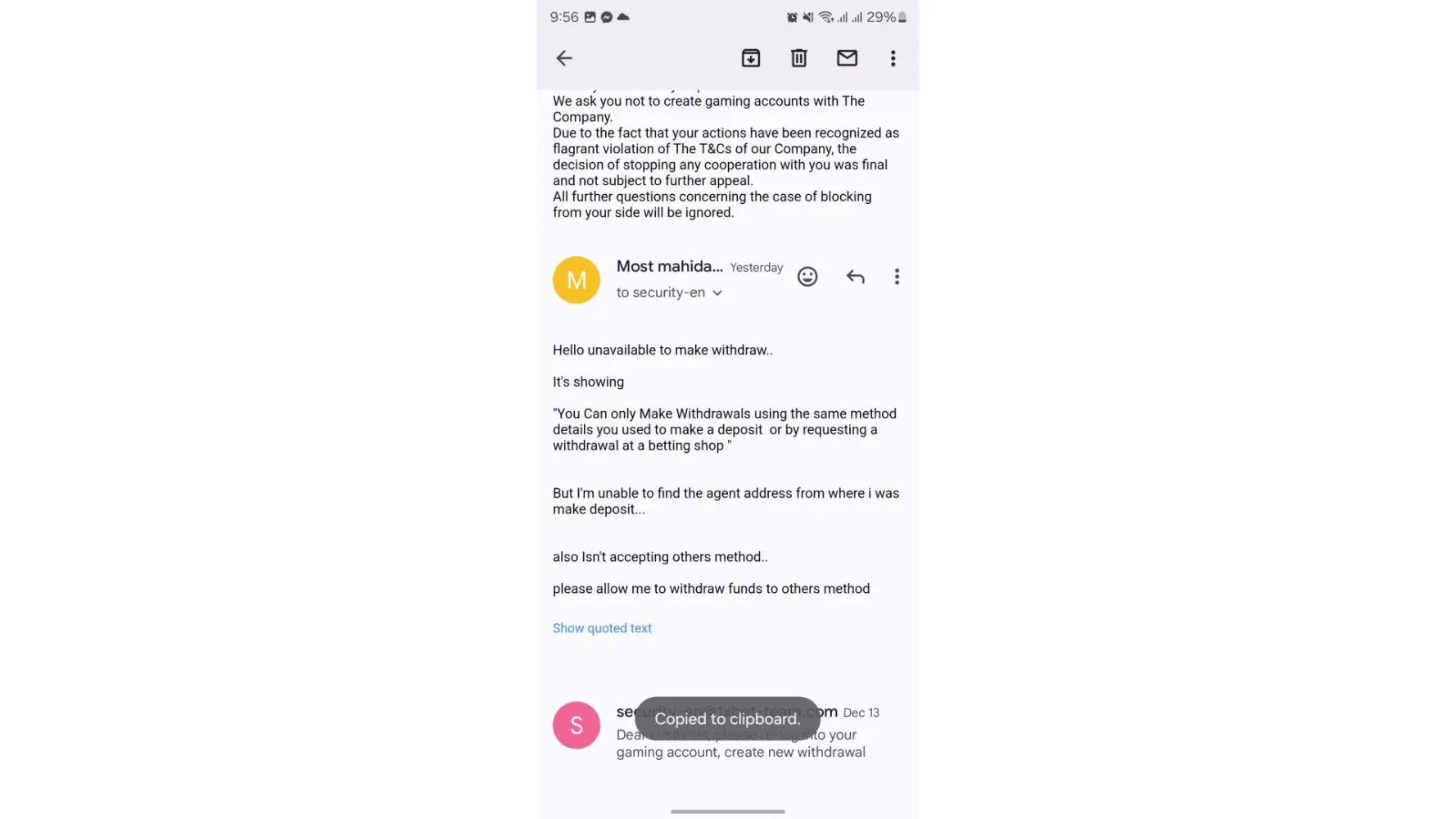Also I sent video proof to security department as they requested if inability to send documents to this address I need to sent proof as I did already still they didn't solving this issue.