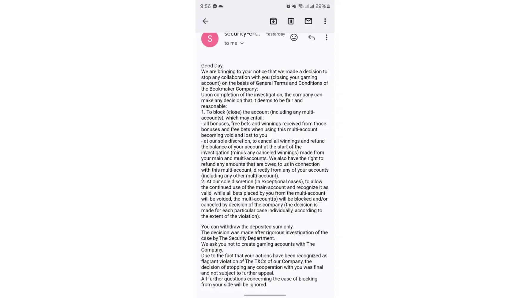 I going under lot of mental pressure because of my illness, and more over above that you are giving me mental torture by blocking my funds. I have not received any funds since you blocked my account. If something happens to me you will also be responsible. I will not play as you say, but release my funds to my account. atleast . It would be the greatest help that you can do to me.