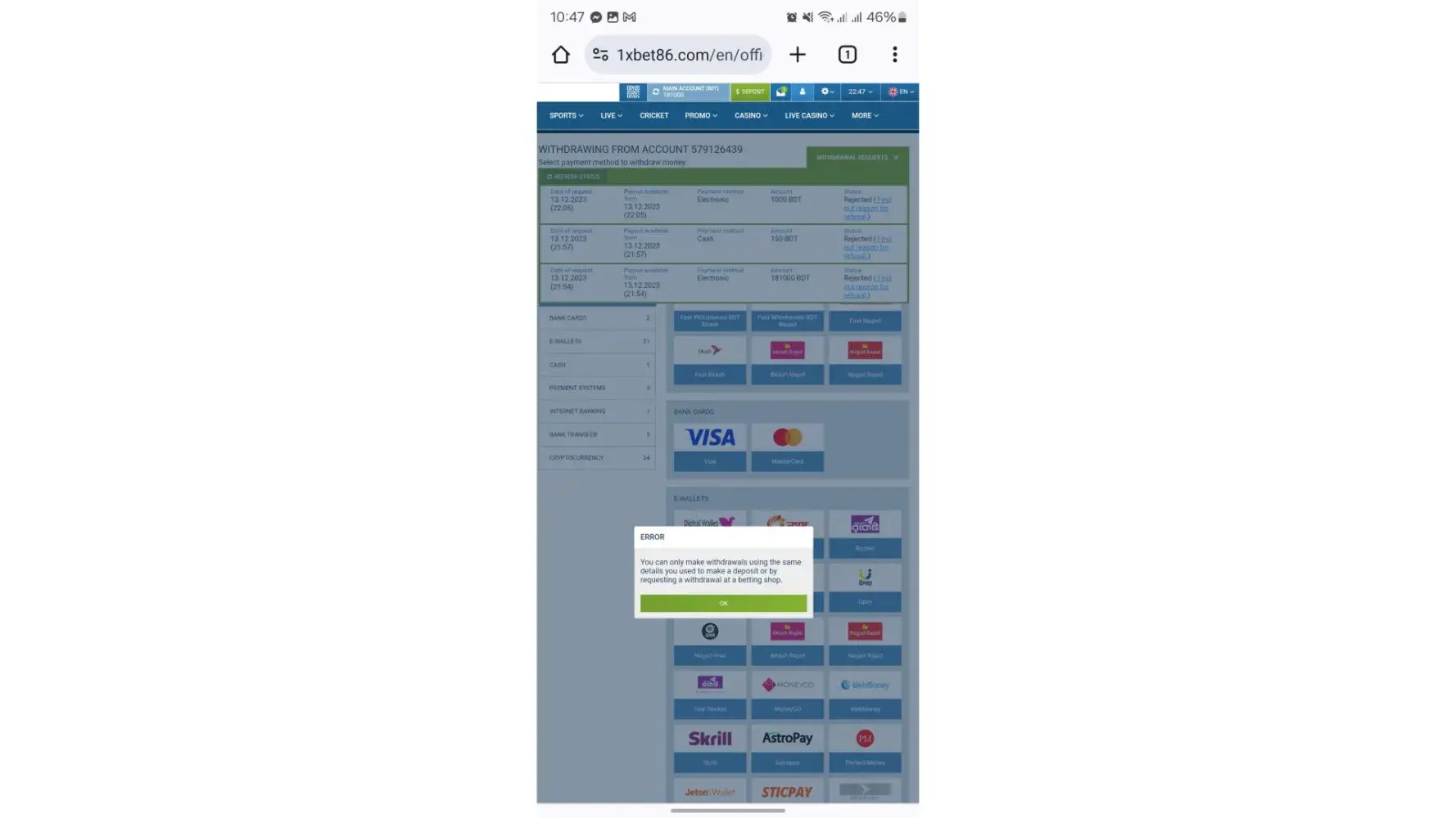 Hi, I am a regular customer of the 1xbet and I have been playing with them since long and well aware if their terms and conditions. One of them is that you have to use same withdrawal method as you use for the deposit. On 12 September 2023 I deposited some amount and won big , when I tried to withdraw, they refused to give me withdrawal in the same method which was used for the deposit. This made me mad and incurred huge financial loss. I want my case to be thoroughly investigated and compensated. My gaming ID is [protected]. Thanks and Regards