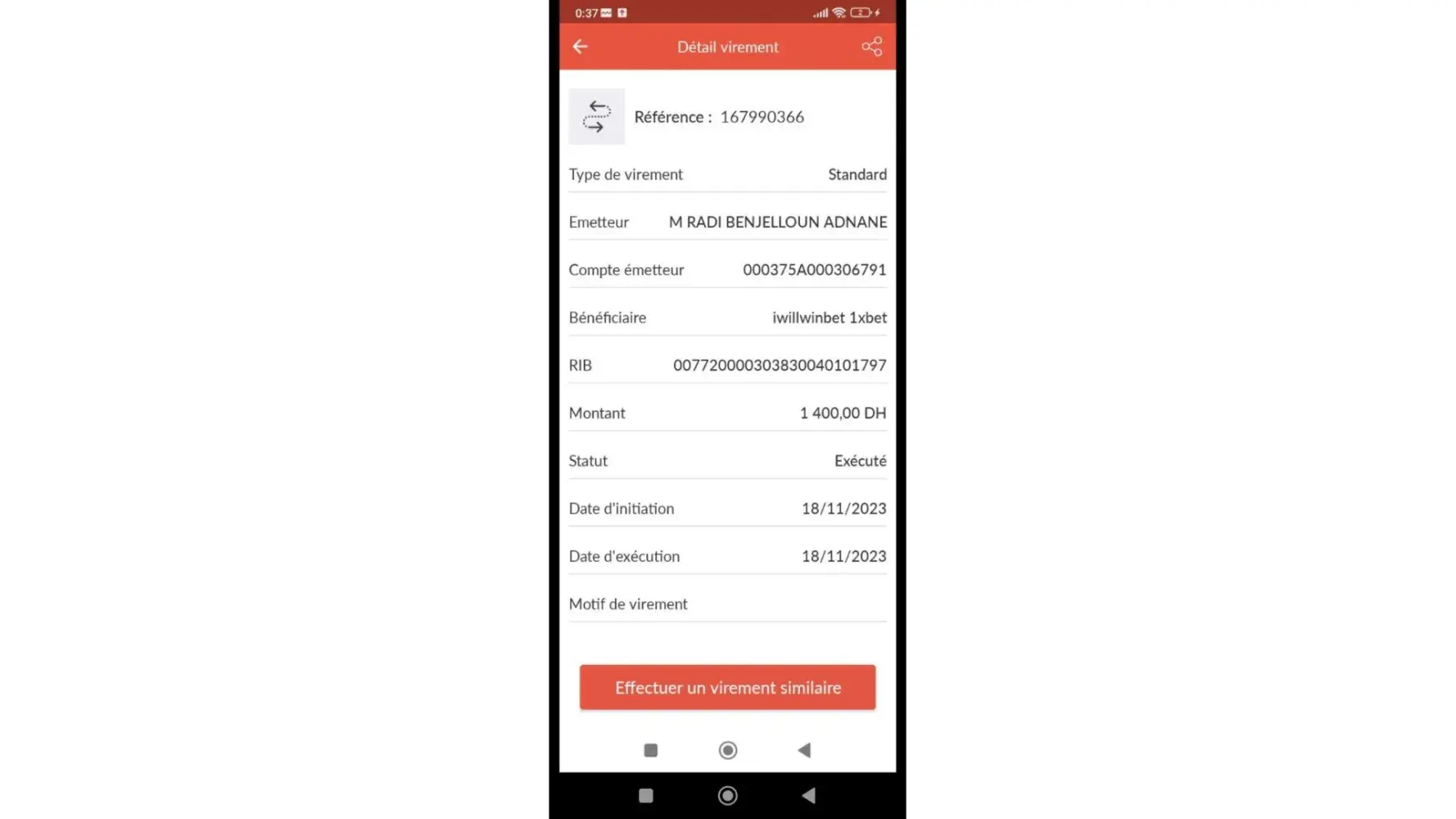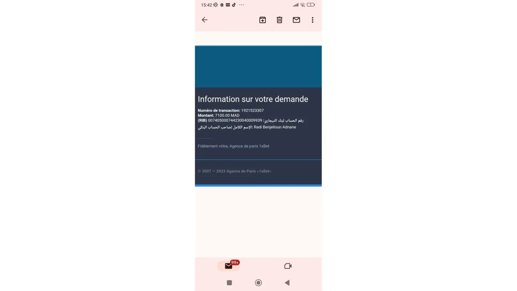 I did the withdraw from my account 1xbet to my bank account then I got surprised that my money in 1xbet was sent to 007405000744230040009939 an account of a person that works with you and I Can proove it to you, because I have a lot of screens of a deposit to this account. Well in fact I got stoled by the person who have this Attijari bank account number 007405000744230040009939 and works with you...