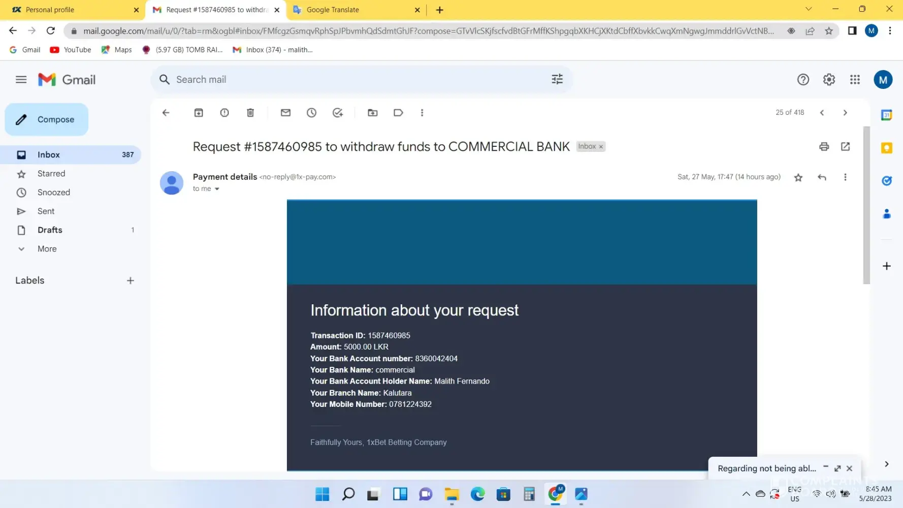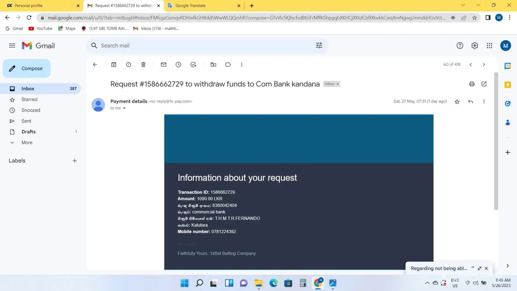 Regarding not being able to withdraw money from 1xbet account