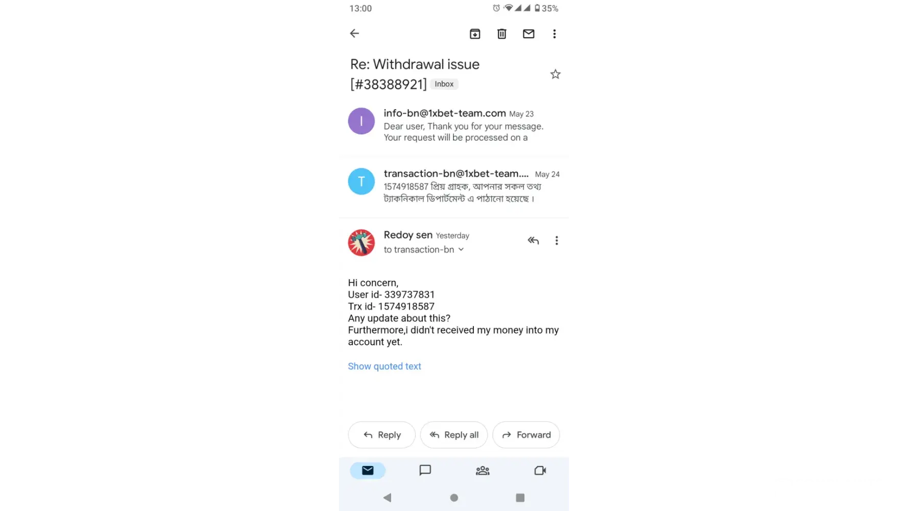 Note: I mail them this email address (public. [protected]@1xpartner.com) from ([protected]@gmail.com) too many times. but still I did'nt received money into my account. I don't know what is going on with 1xbet. I am really tired of this issue.