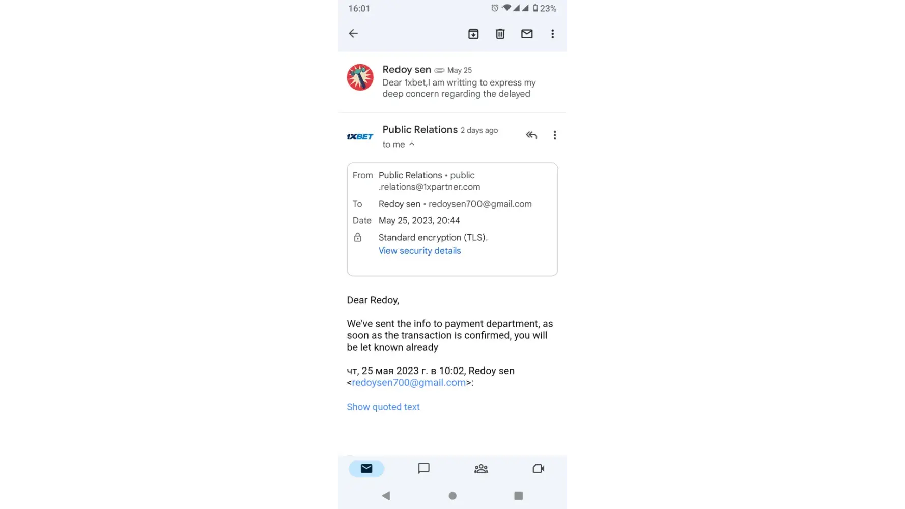 On 24-05-2023 I received a response from the support team stating that my case has been forwarded to the technical Department. They instructed me to reach out again after 5 hours. However, it has been more than 7 hours since I sent the follow-up email, and I have yet to received any update or resolution regarding the status of my withdrawal.