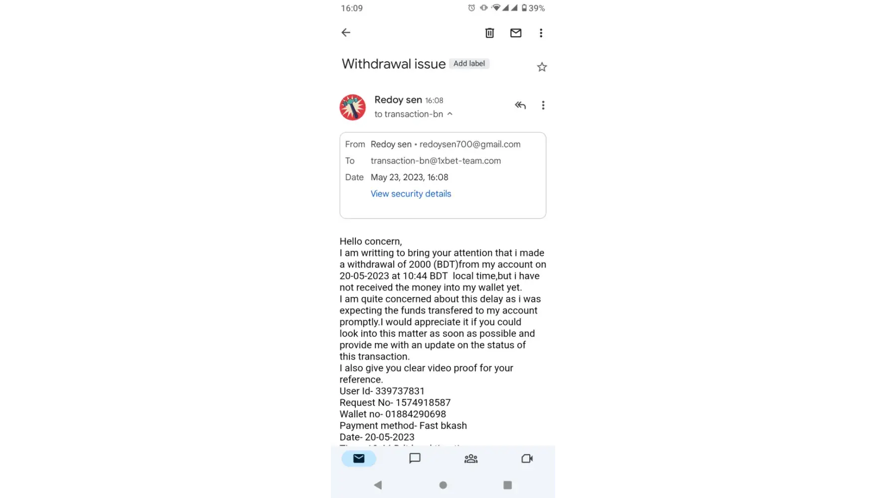 I am writting to express my deep concern regarding the delayed withdrawal transaction of 2000 bdt that was initiated on 20-05-2023 at 10:44 Bd local time. Despite multiple attemts to resolve the issue by sending emails, the problems still remain unresolved, and I have not received the funds in my account.