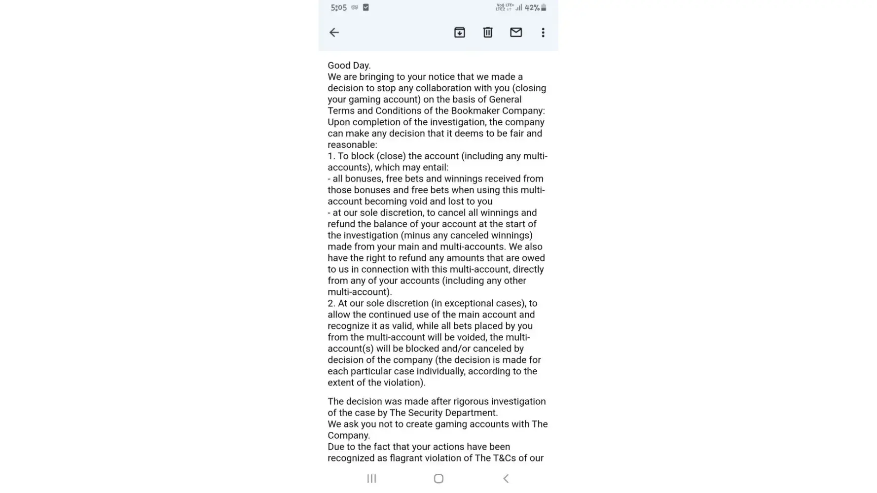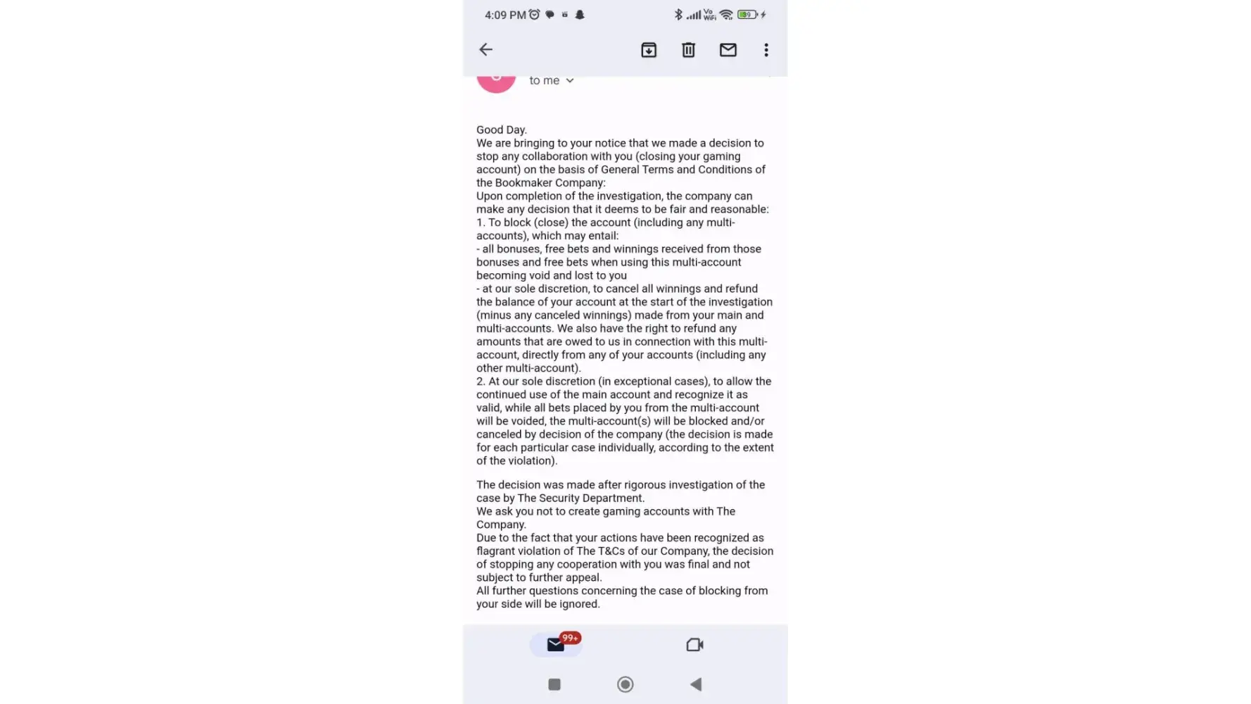 We are bringing to your notice that we made a decision to stop any collaboration with you (closing your gaming account) on the basis of General Terms and Conditions of the Bookmaker Company: