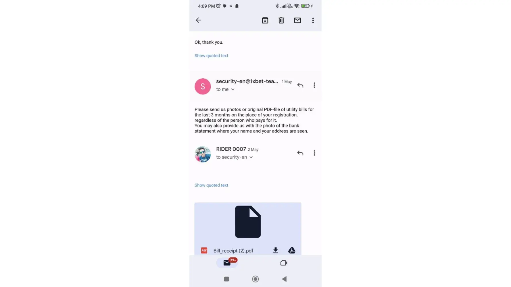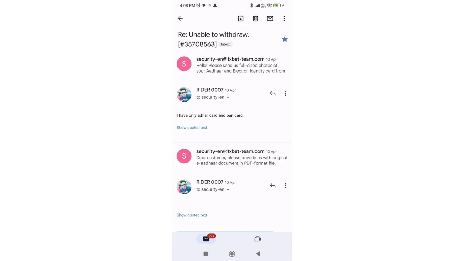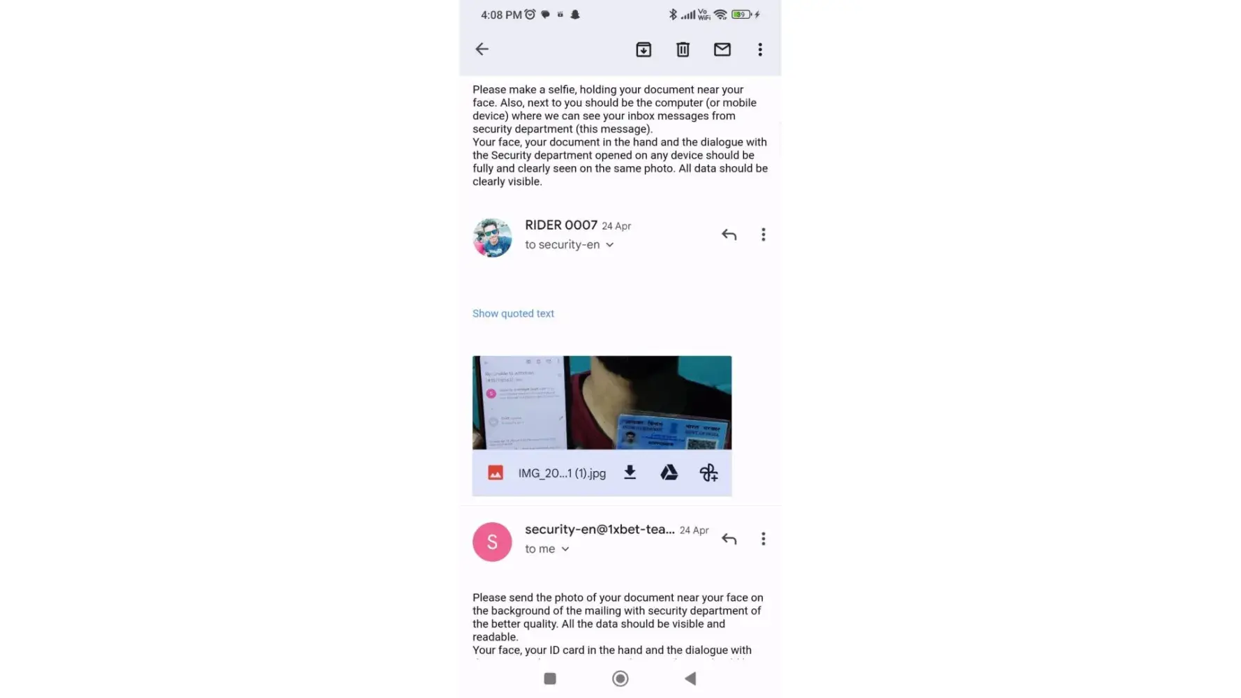 When I contacted their security team regarding my withdrawal request, they asked me for Identification Documents, I provided my NID photos, my selfie holding my ID card next to my face and answered their questionnaire,