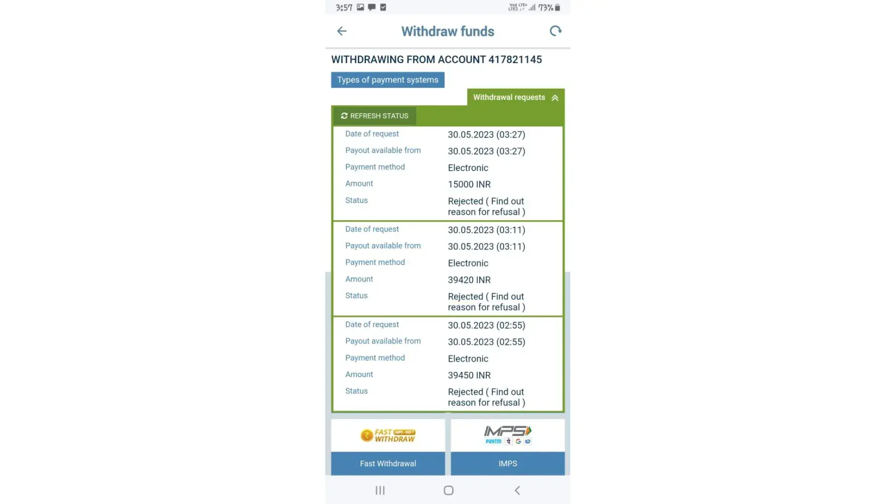 On 23/05/2023 I made a payment to the upi id [protected]@upi . But after making the payment the upi id for payment on the app got changed due to which I was not able to make a deposit request at that time but as soon as I saw the same upi id again on the app then I made a request but it got rejected. The money has been deducted from my account and I have not received it yet on my 1xbet id.