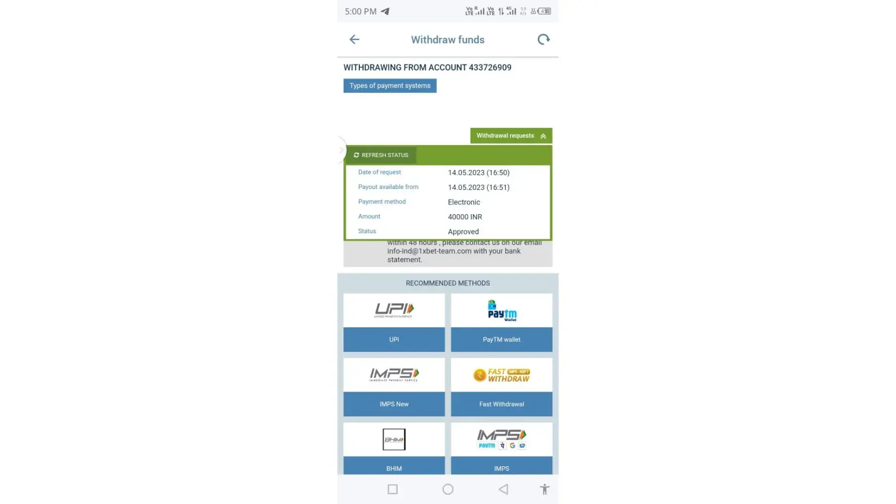 On 17 may 2023 time 6.25 pm IST i try to deposit amount of 2700 INR in to my 1x bet account my Id: [protected] and deposit amount in desire information of reciever aaccount as under