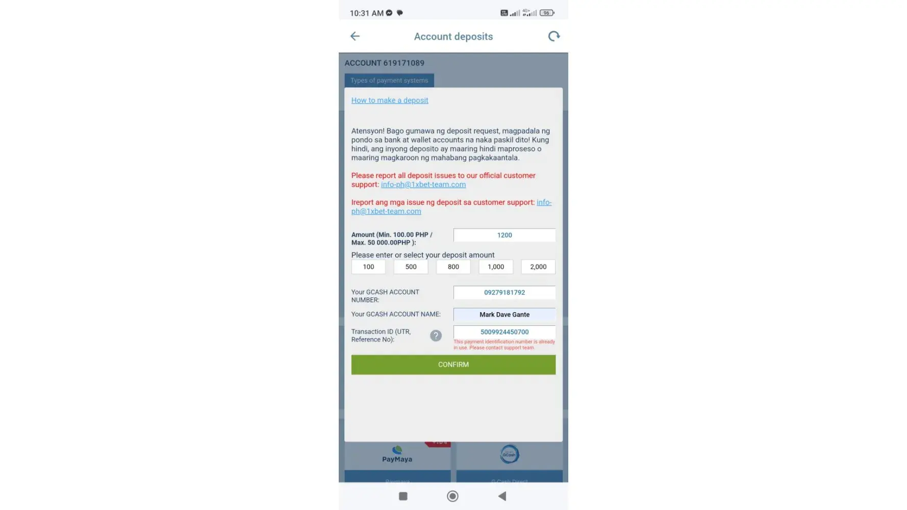 I have deposited Php1200 last May 18,2023 at around 10:50 pm but it was being rejected by the operator so ilI reported to the customer service and repiled to perform below instruction so I did it today but unfortunately I cannot still proceed with my deposit due to payment identification number already in use.