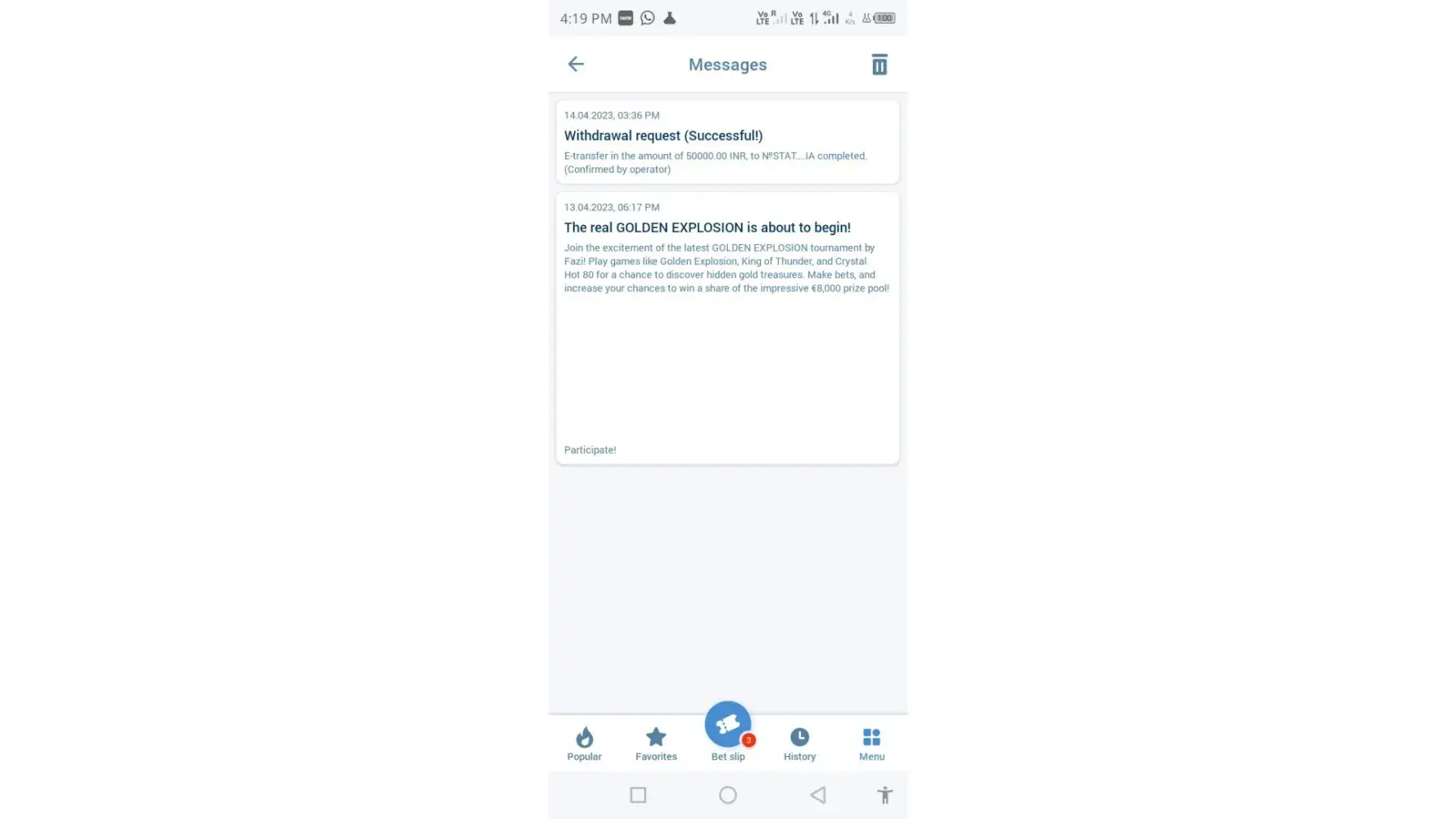 On 14-04-2023 1xbet gaming app notification showing that my withdrawal of rupees 50000 is successful but money not reached in my bank account till now.