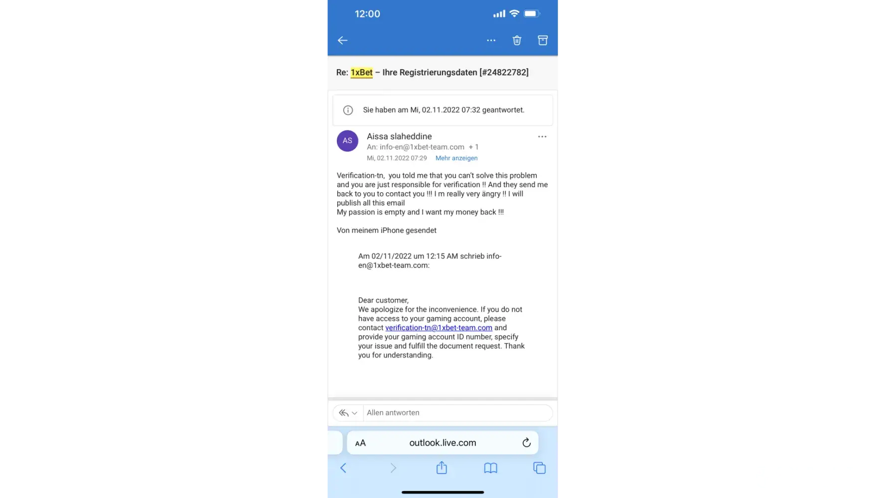 Ohhh :) I have the same case since 6 Month they block my account with the first deposit 300 Tunisian dinars … after that no answer for my emails …. Telef support they say be passion and then they block my number …. Always the same case with all client about 1xbet … they block the money and they ignored you … is my mistake that I open Account in such company … very miserable really …