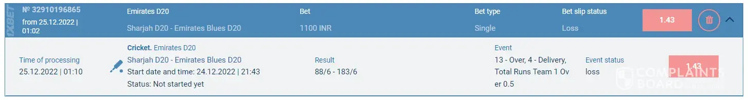 1xBet I won the bet in the match between sharjah d20 vs emirates blues d20 but showing loss and money deducted