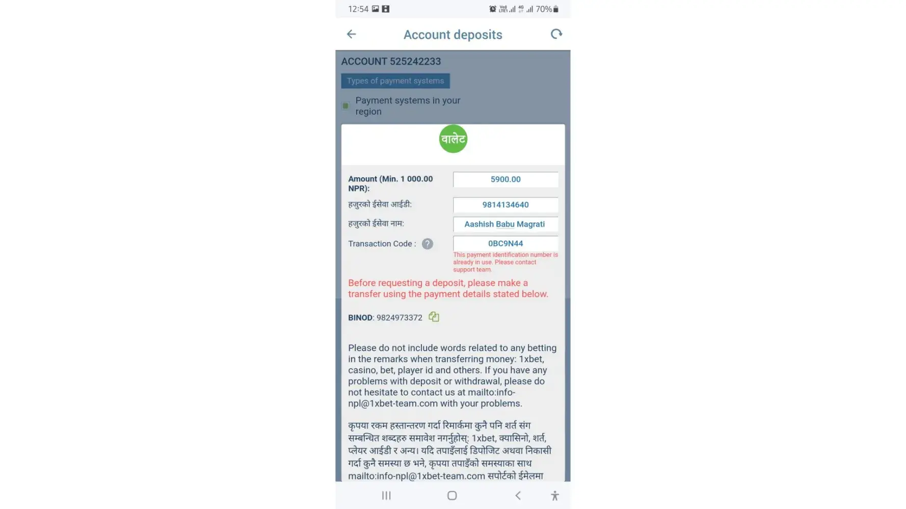 I had made a transaction of 5900npr to the agent/broker provided by 1xbet through our local wallet eswea and there is a process that a transaction code is genereated and you have to use that code in depoosite section of eswea wallet. Then what happended is that with in kess than a minute that my transaction code is already used.I mean how is that possible.Me and only the agent that i transfer money know the transaction code so I could not deposite any amount after transferring also which is complety scammed by broker.I got my money scammed. 1xbet is not supporting in this.
