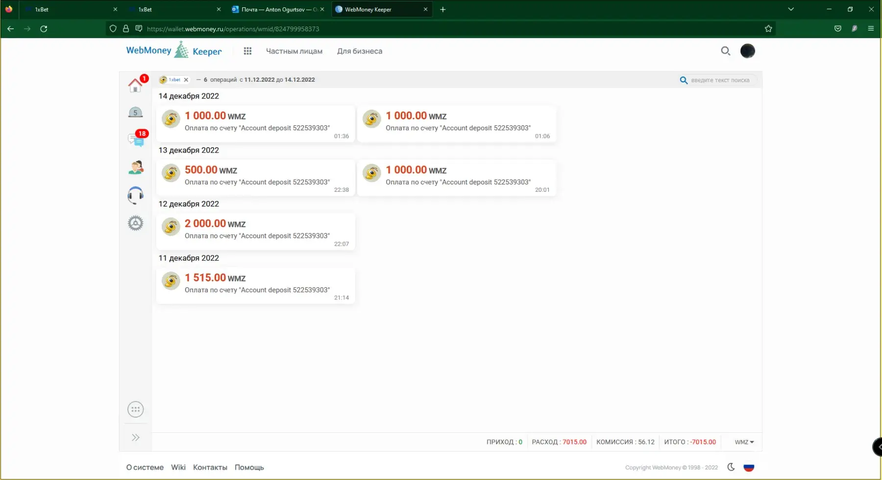 Deposit amounts: 1515, 2000, 500, 1000, 1000, 1000 USD. via Webmoney
