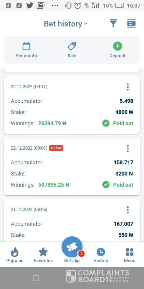 I Deposited money fist time via Webmoney system 1515$ & ordered withdrawal once (successfully) same amount after winning. After that, I made bets, lost, won, replenished my account several more times, until I got positive balance.