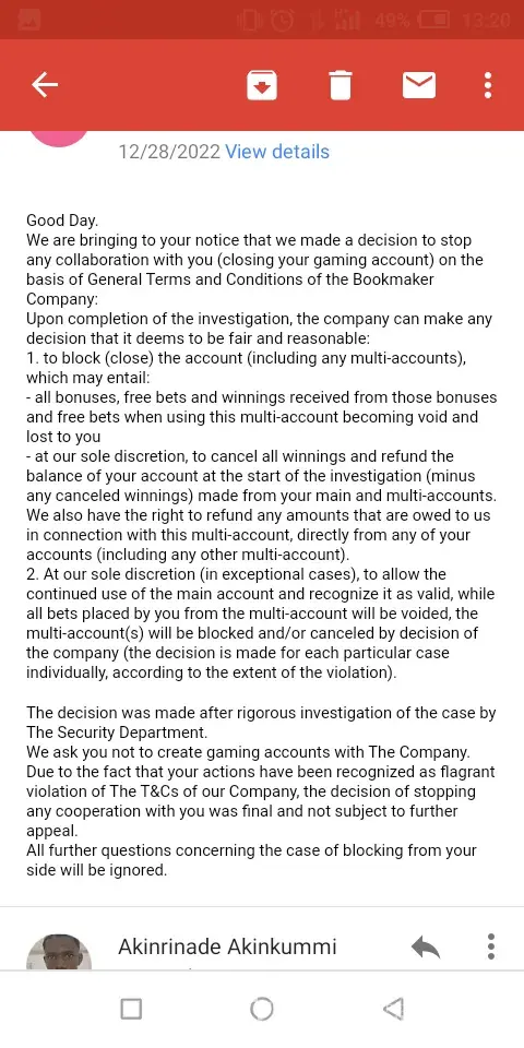 Now an e-mail came from 1xbet that the account is blocked. we didn't cheat, can't two people use 1xbet account in a house? They haven't approved my account for 10 days, we sent whatever document they wanted, now they send an e-mail that the account is blocked, so 2 people in 1 house can't use 1xbet account, is it such a ridiculous thing! we didn't cheat give me my money now!