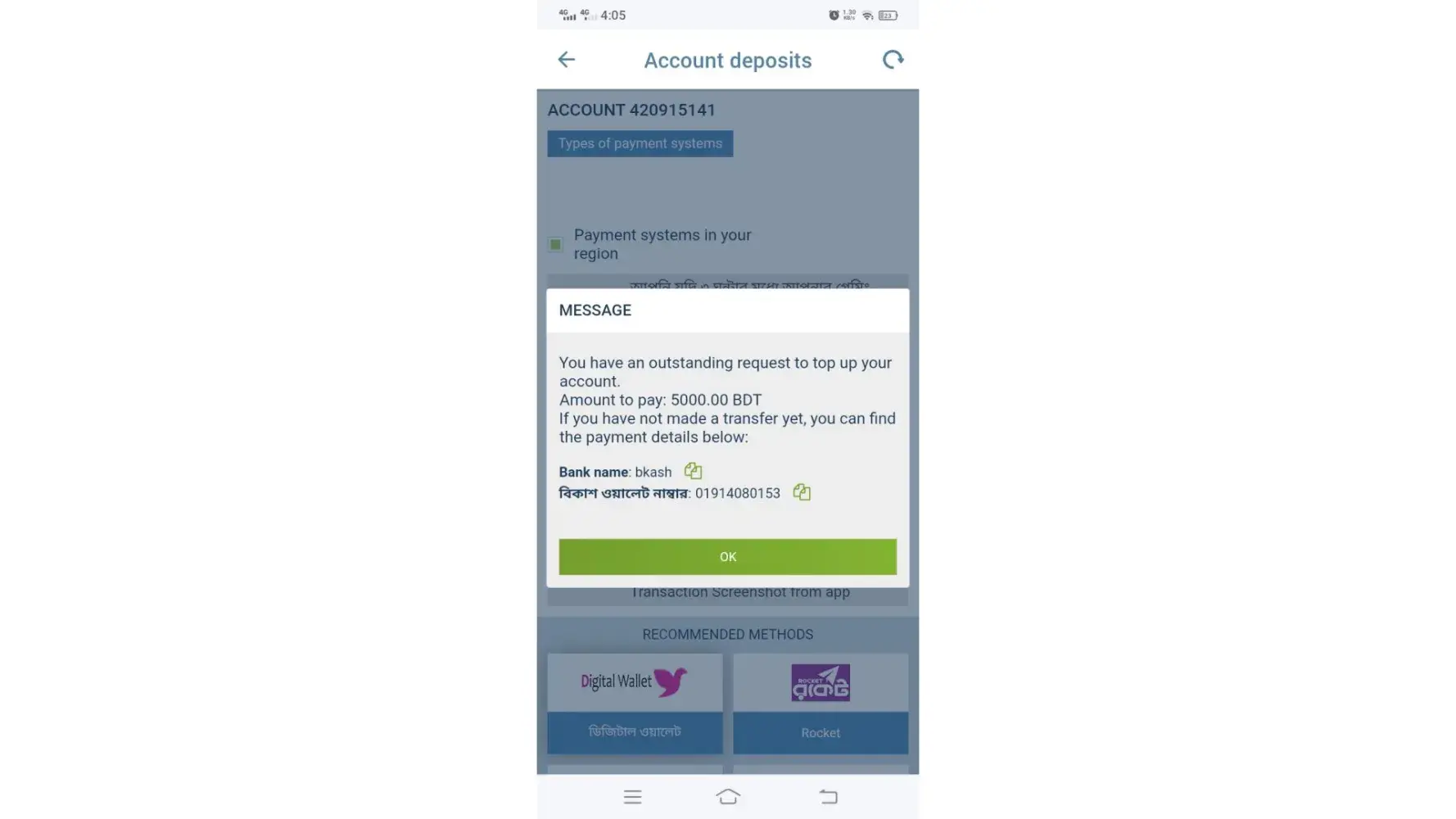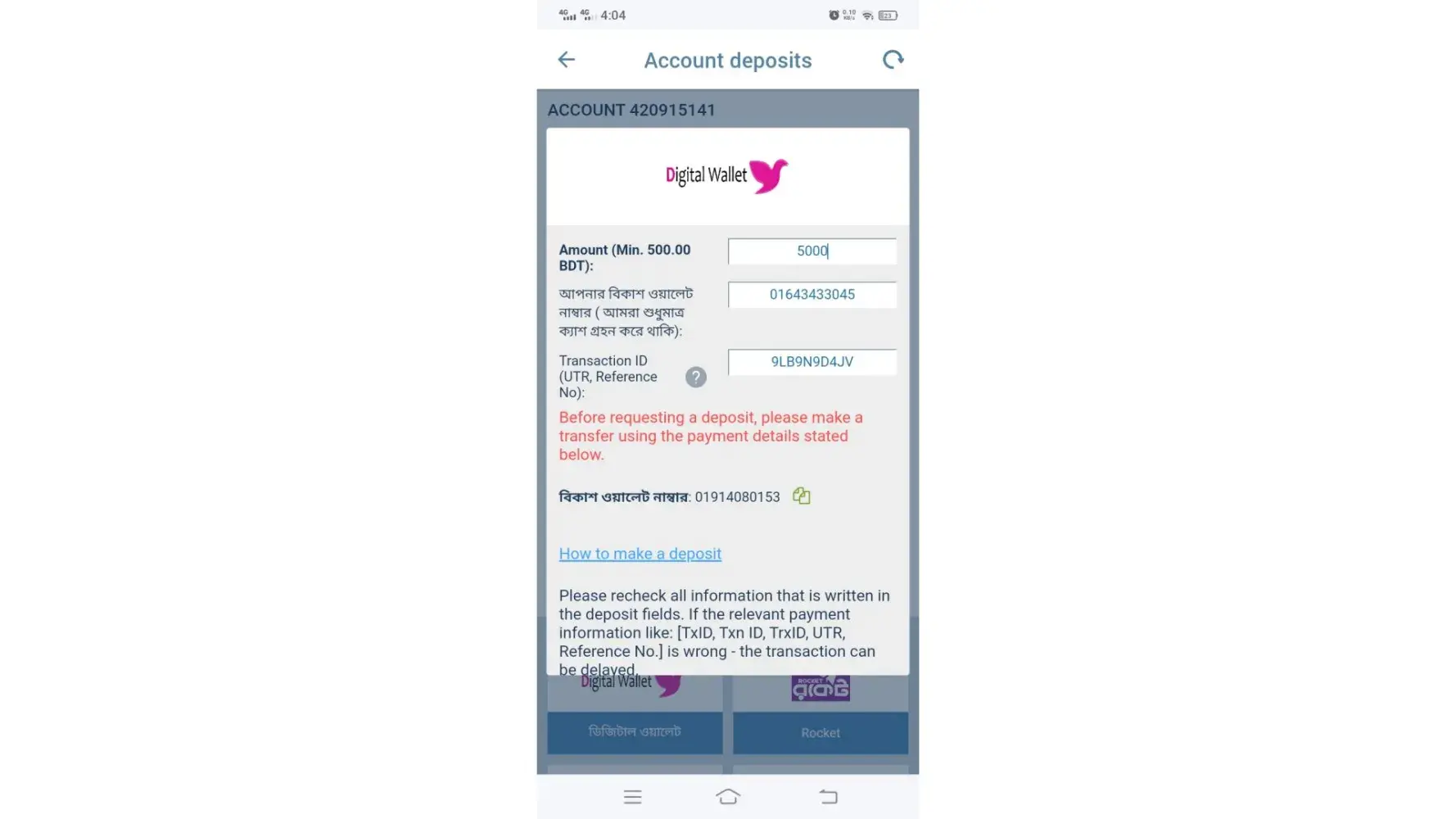 Deposit transaction in the amount of 2000.00 BDT via epayment rejected by operator!