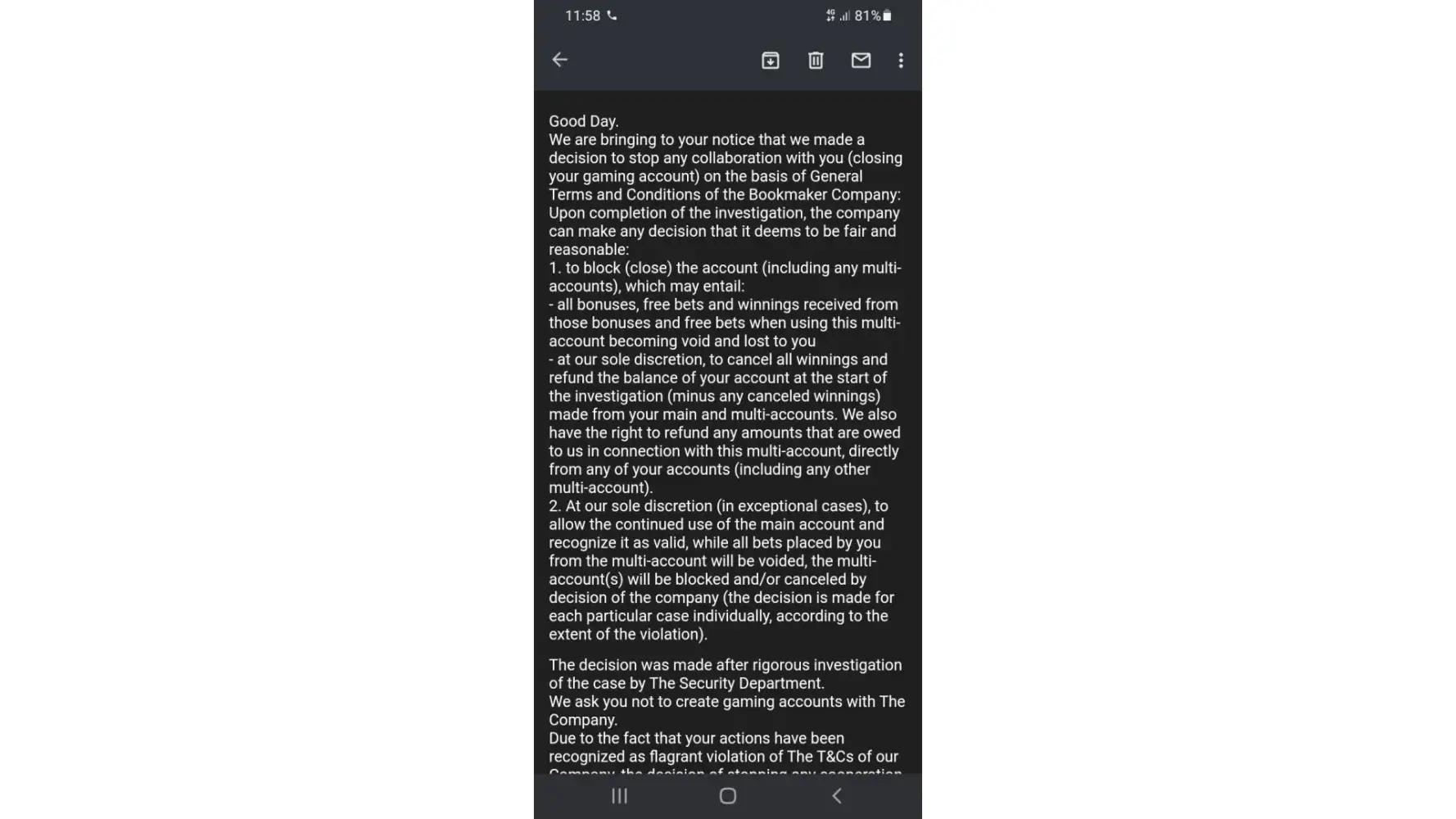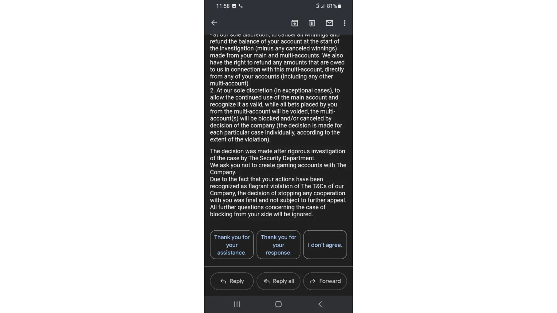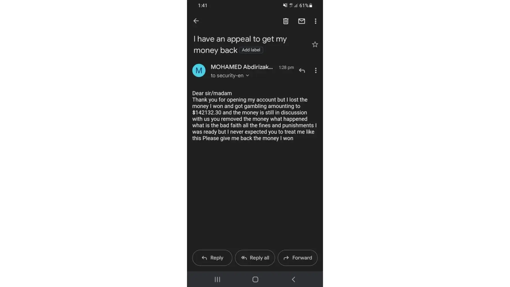 And the main points of this complain or report is ,i was sent a message that my