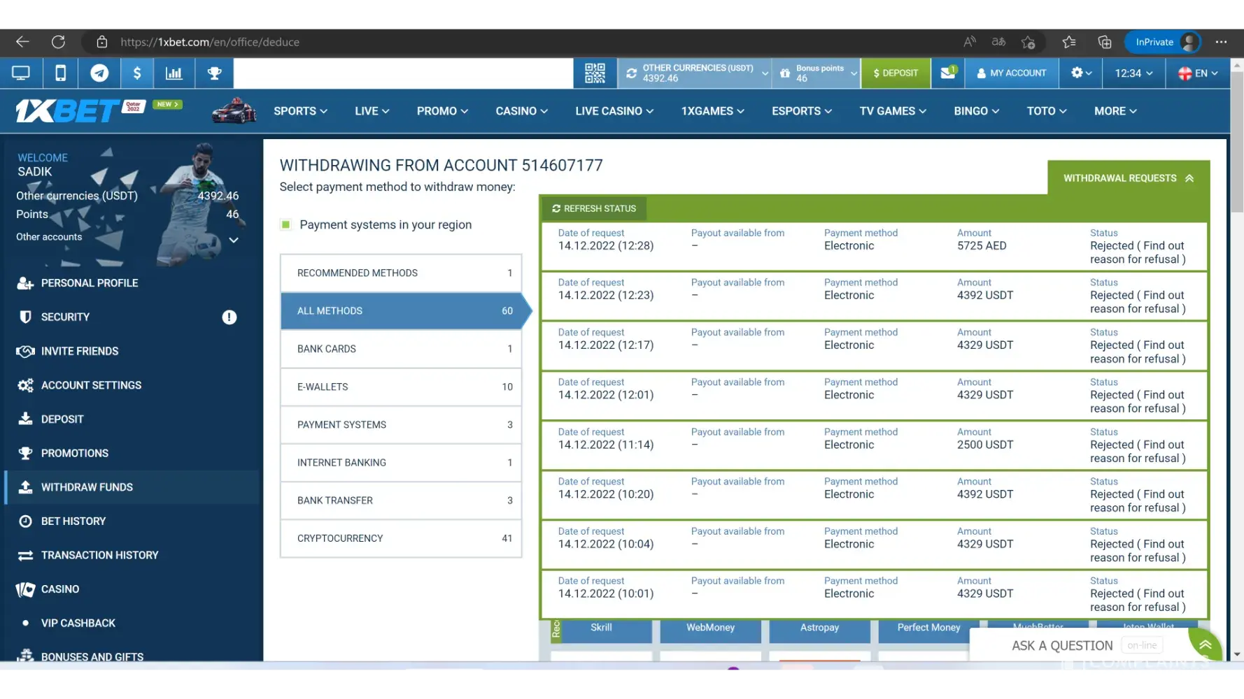 I tried to withdraw funds by my master credit card and 1xbet rejact it many times, Your customer service called me and asked me to try another withdraw way by E-wallet, i did it skrill but its rejected, they called me later and said send email to security-en@1xbet-team.com i sent them emails and they asked me to send a colored passport photo copy with jpg format and i sent it to them and nothing solved till now all my withdraw funds rejected.