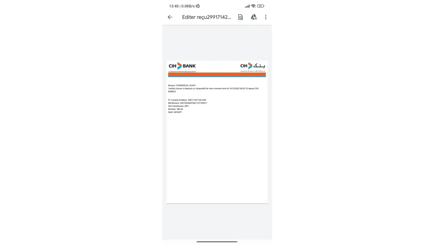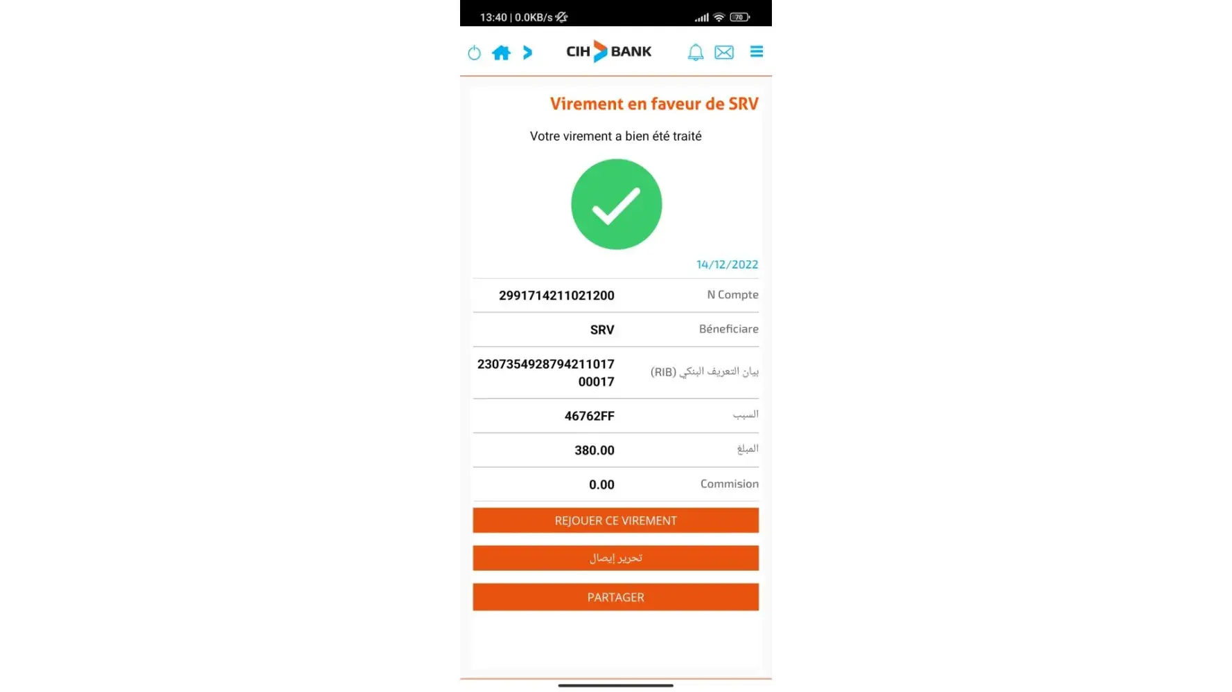 I have made a second fund deposit to my account, after sending via CIH bank to SRV 1xbet, the application refrehsed, so the Motif code was changed,