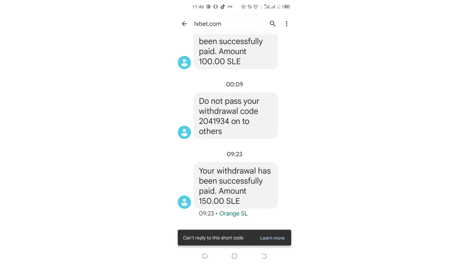 On the 28th of October 2022, I won Le 150. But I only received Le 55 via orange money. Below are details of the transactions;