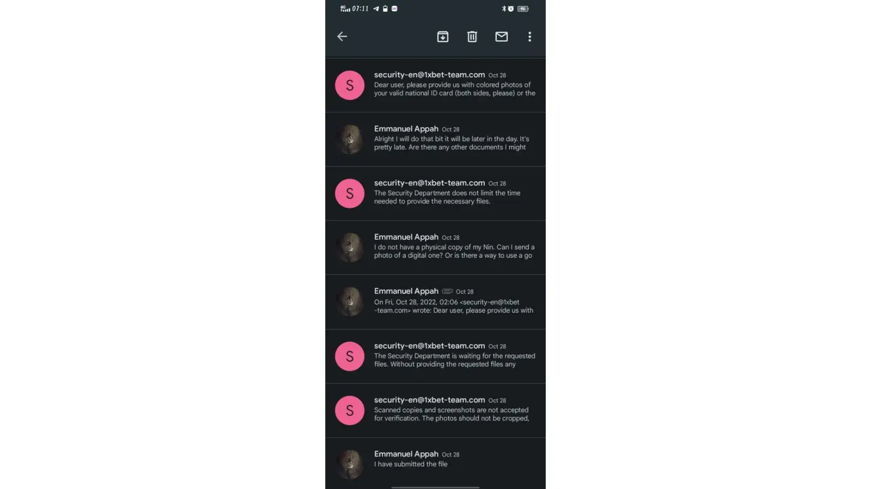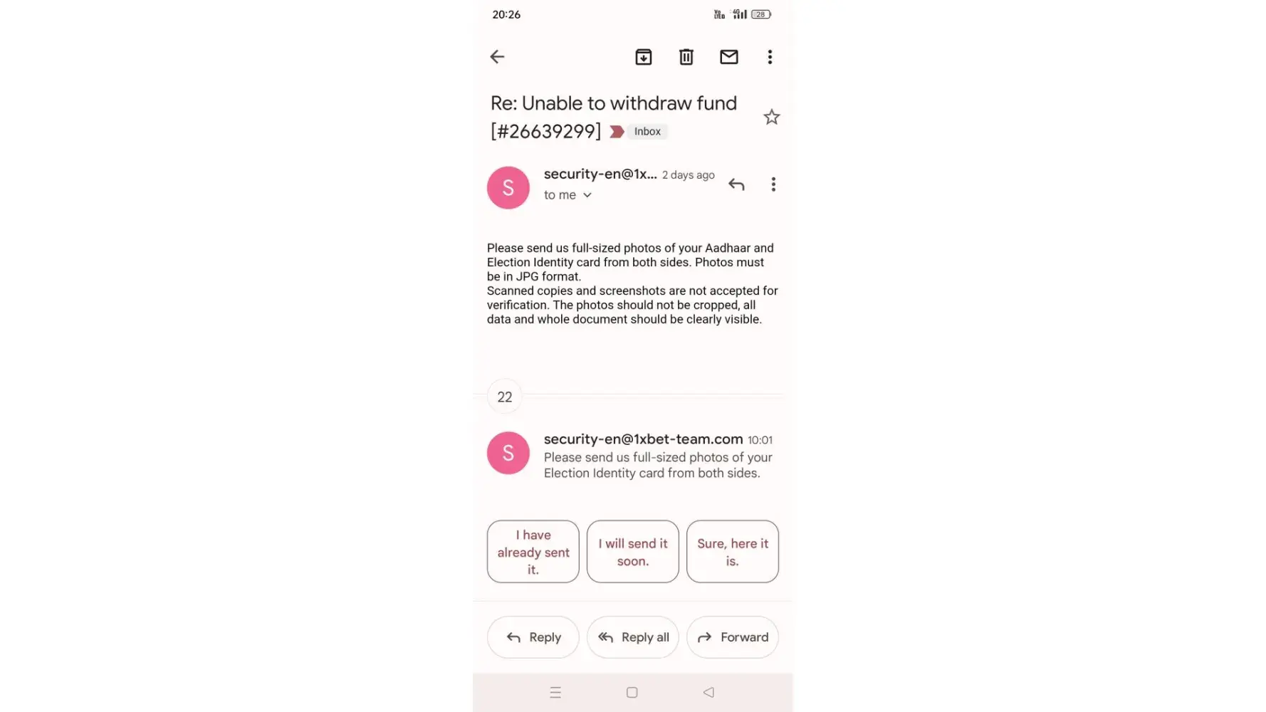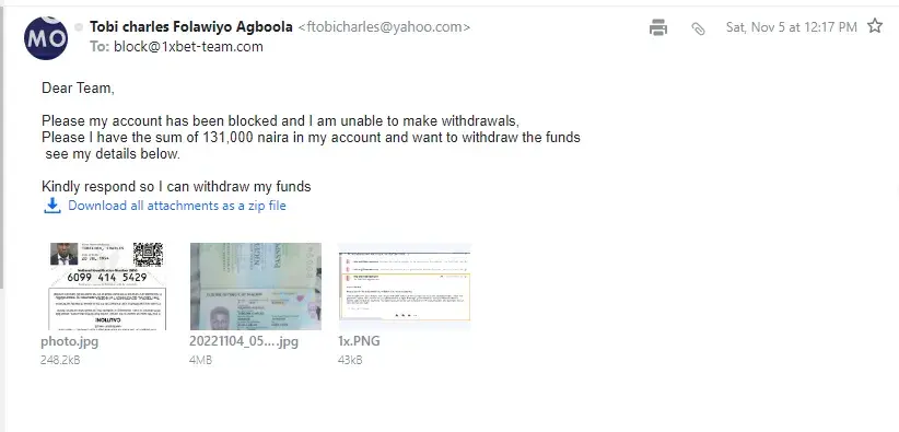 I am writing/forwarding this email to as complain of 1xbet security team.I have sent almost 40 email to your security team regarding verification of docs.I do not know yet why securty team is not verifying my docs.I am sending all my docs to you also.u can check my docs are legal and valid.pls escilate this matter to higher authority.allow me withdrawal