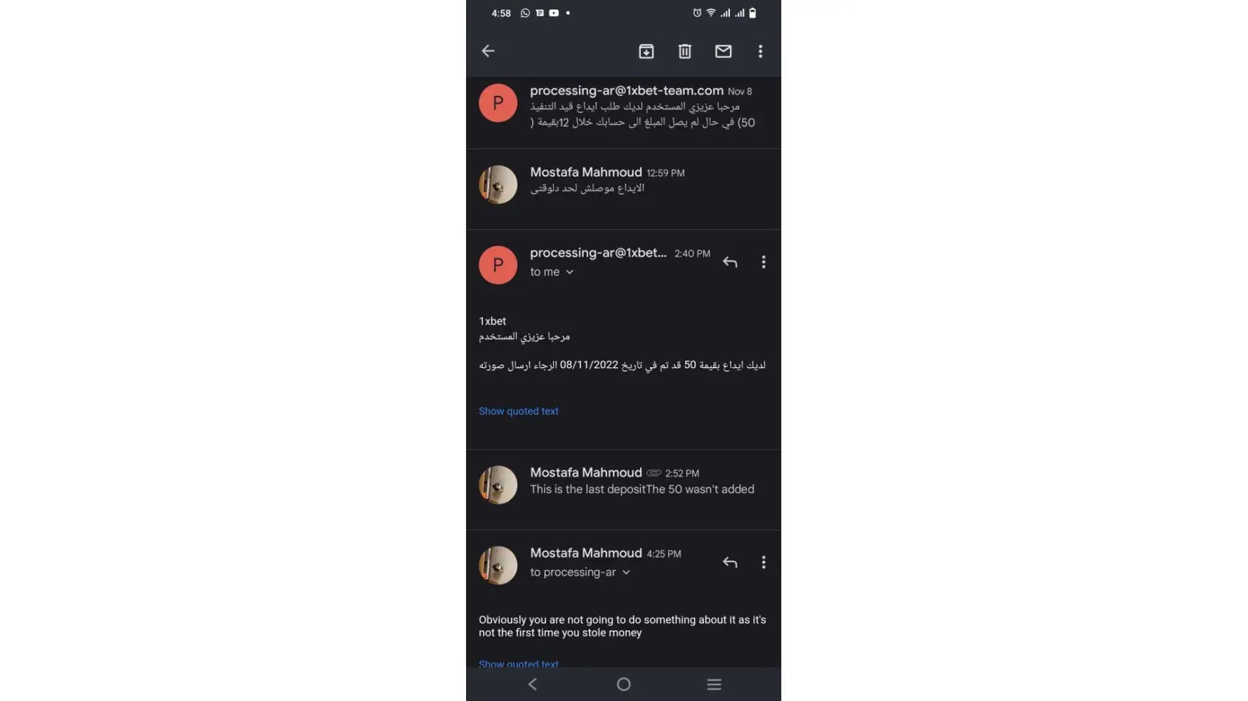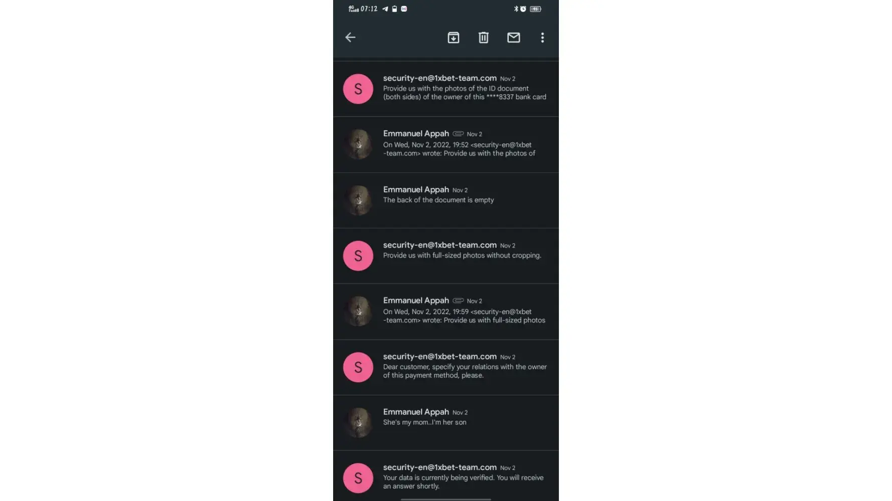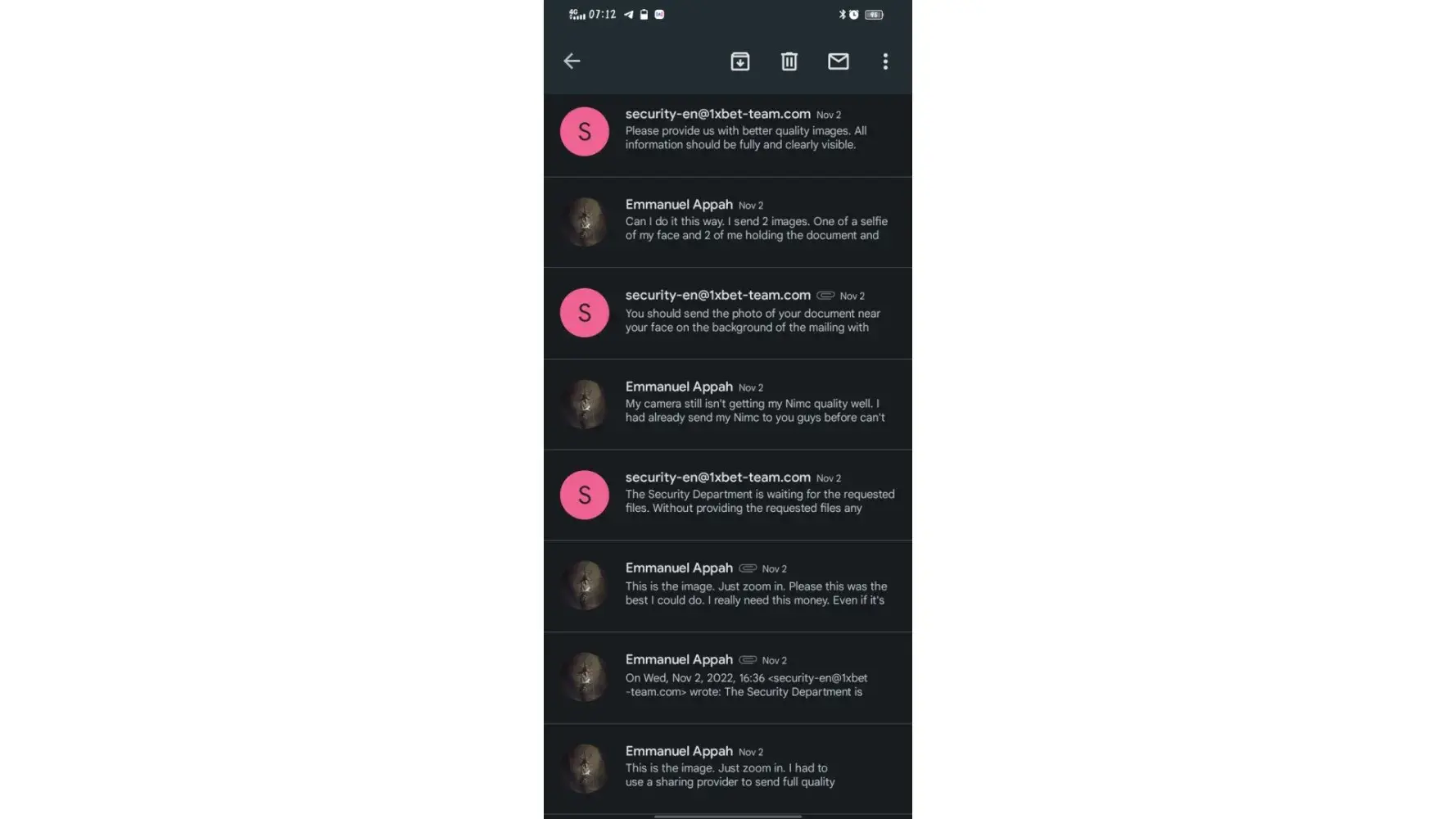 I am writing/forwarding this email to as complain of 1xbet security team.I have sent almost 40 email to your security team regarding verification of docs.I do not know yet why securty team is not verifying my docs.I am sending all my docs to you also.u can check my docs are legal and valid.pls escilate this matter to higher authority.allow me withdrawal