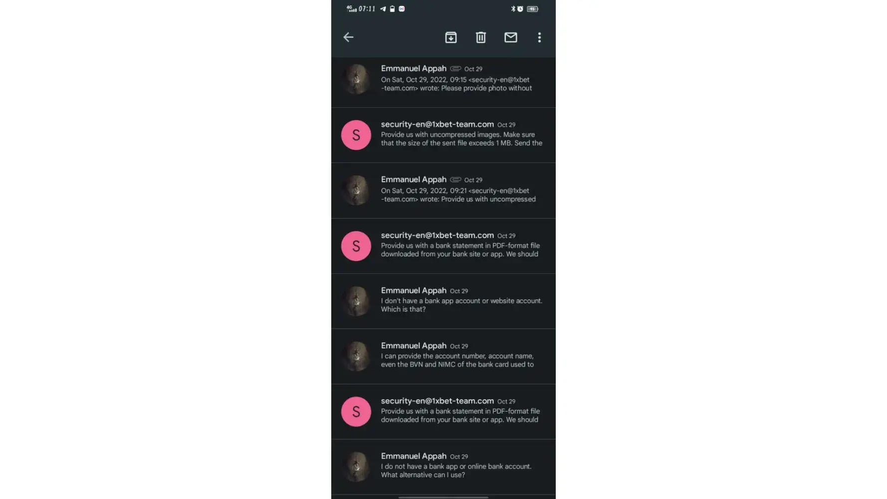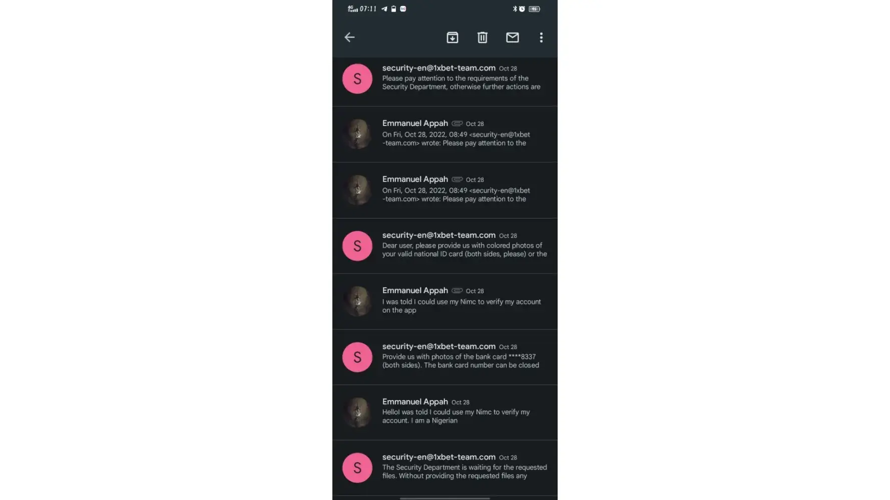 Which I did. I was them told to send a picture of my mom's Nimc. Which I still did. I was then asked if I had any relationship with someone I did not know, which I said, none.